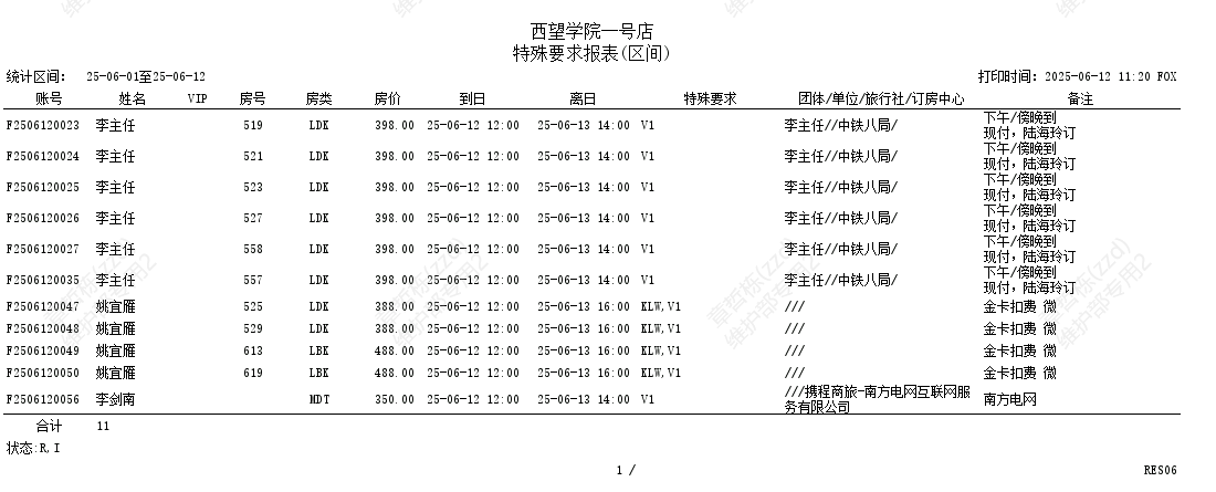 [报表用途]:查看指定日期范围内客人的特别要求以及注意事项。