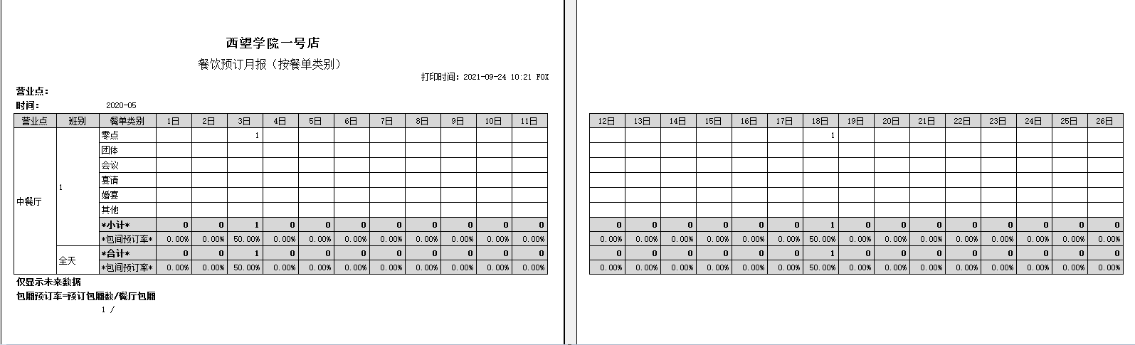 【适用范围】:门店分析,适用于预订处、餐厅主管了解选定月份每一天的预订数量