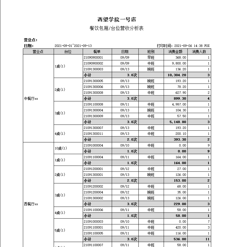 【报表用途】:用于分析哪些包厢(台位)特别受欢迎,查看这些包厢的消费金额水平