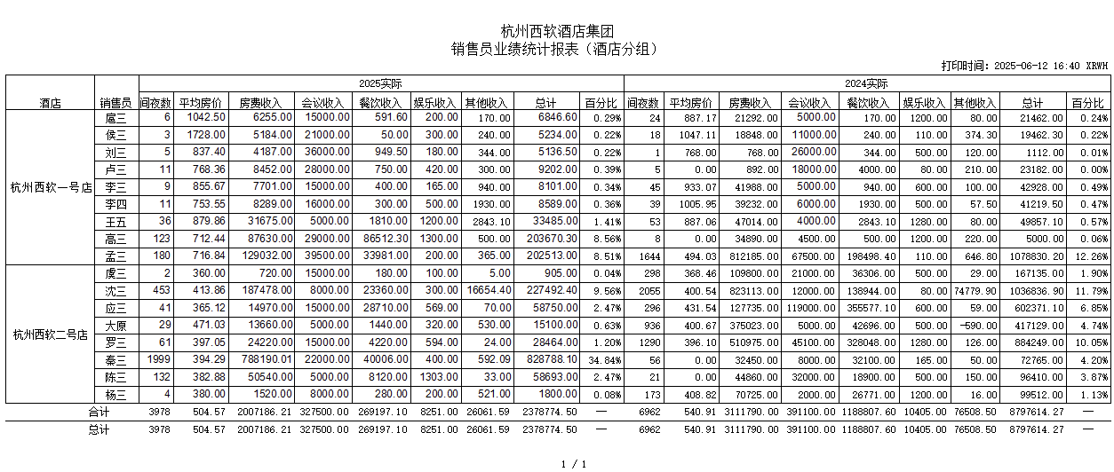 [报表用途]:查询各成员酒店销售员业绩状况,间夜数,平均房价和各项收入。
