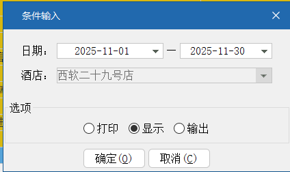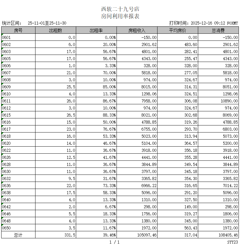 [报表作用]:可以显示出一段时间内,每个房间的出租数、出租率、平均房价、房费收入总消费信息