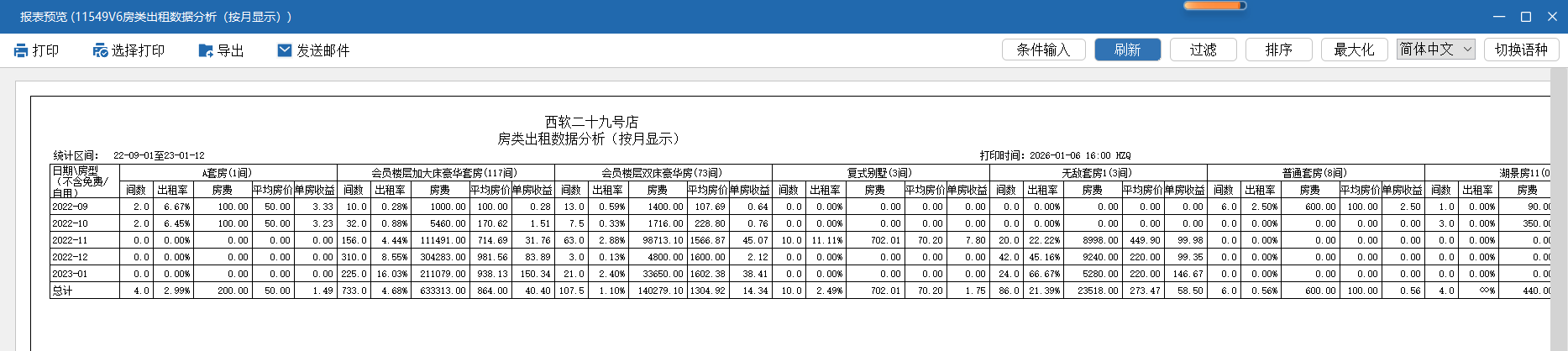 [特殊说明]:报表是交叉报表,房费过多的情况下可以excel导出,但是无法A4纸打印