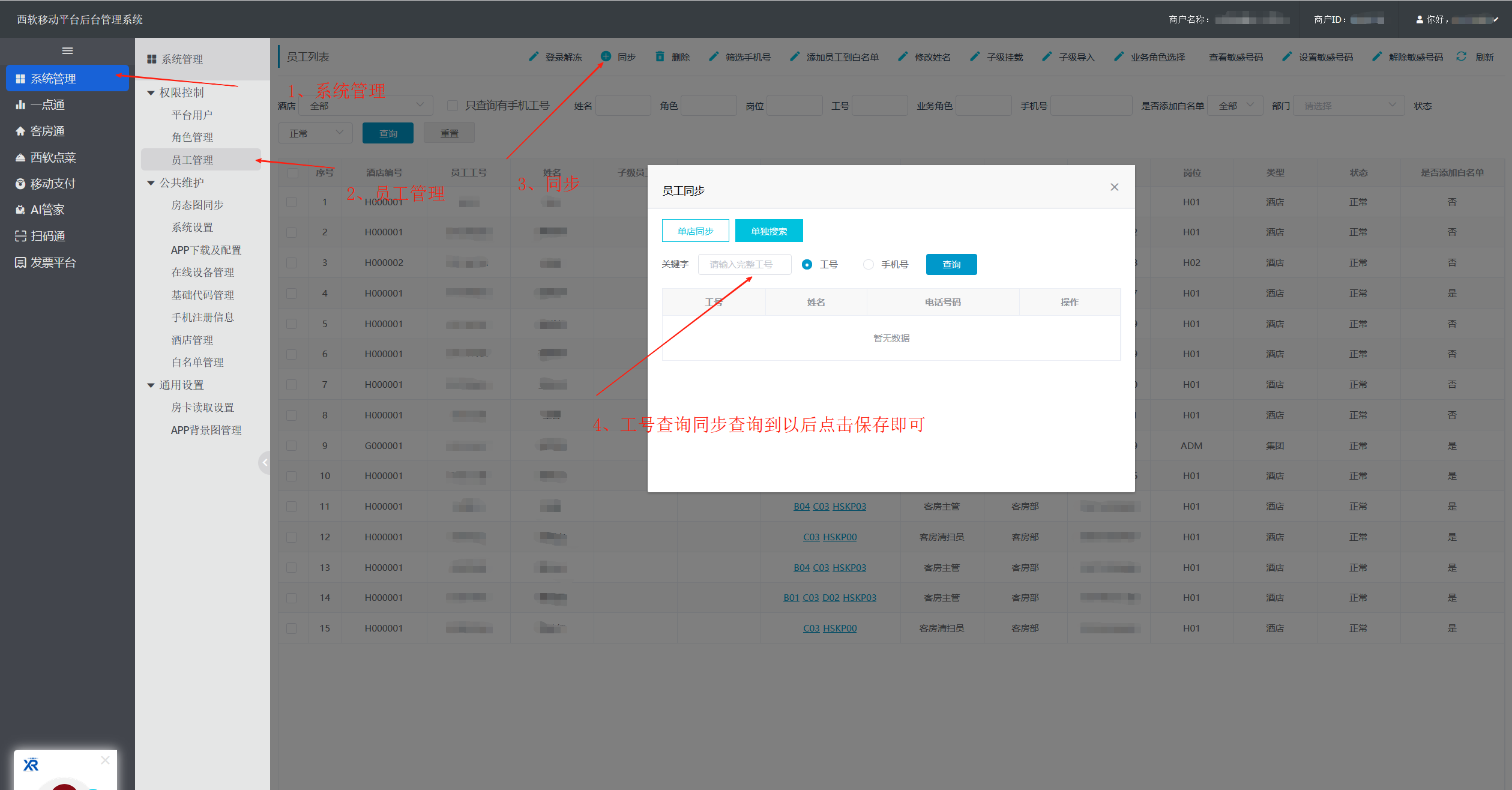 登录mob.foxhis.com以后,系统设置–>员工管理–>同步/保存