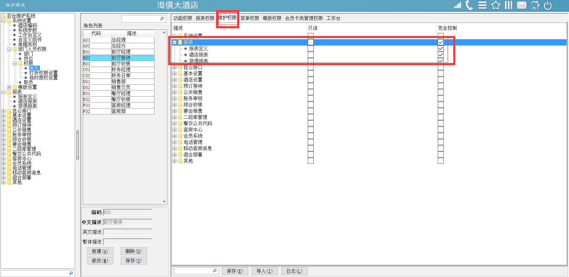 酒店里面不同的部门、不同的岗位对系统功能上的操作权限不一样。不同的岗位可以通过角色代码进行设置表示,然后通过设置角色权限来控制员工的操作权限。例如:新增加“前台接待”角色,改角色有前台接待、宾客账务处理、预定、在住客人、离店报表的查询权限。