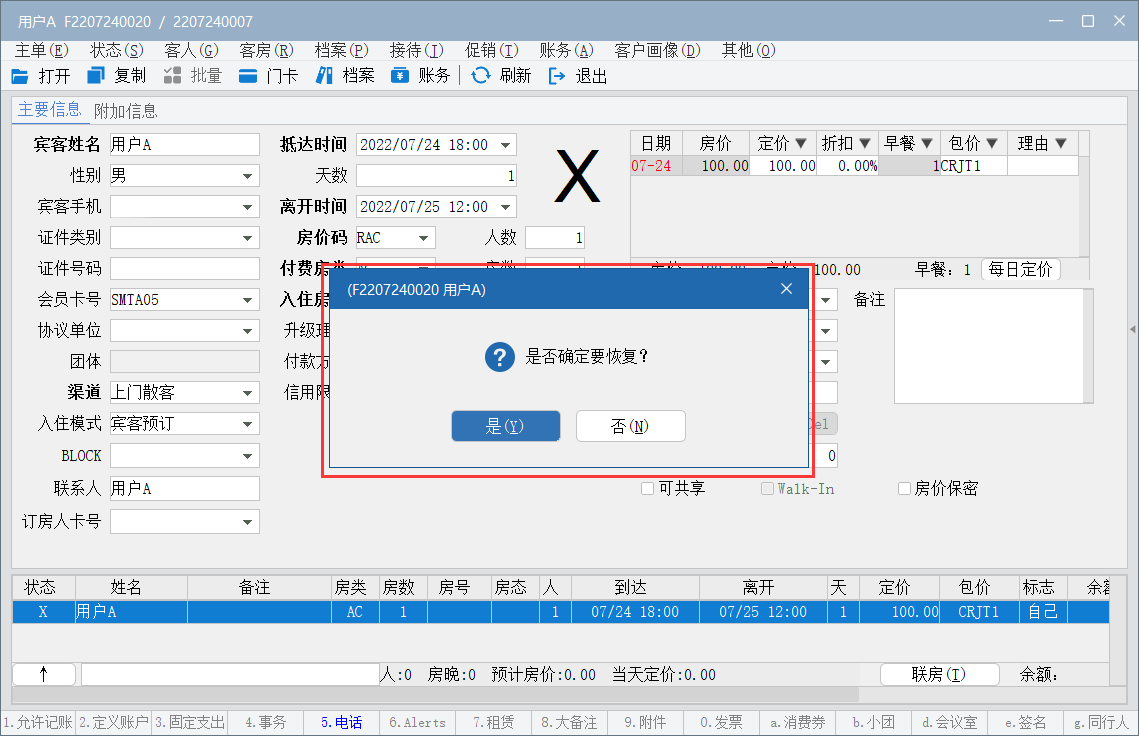 (3)系统弹出确认窗口,单击〖是〗即可。恢复成功后,宾客状态由 X→R。如下图: