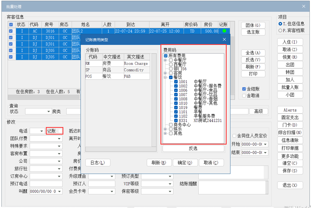 当团队成员房间只允许挂餐饮费用账务,可使用批量功能进行批量设置。