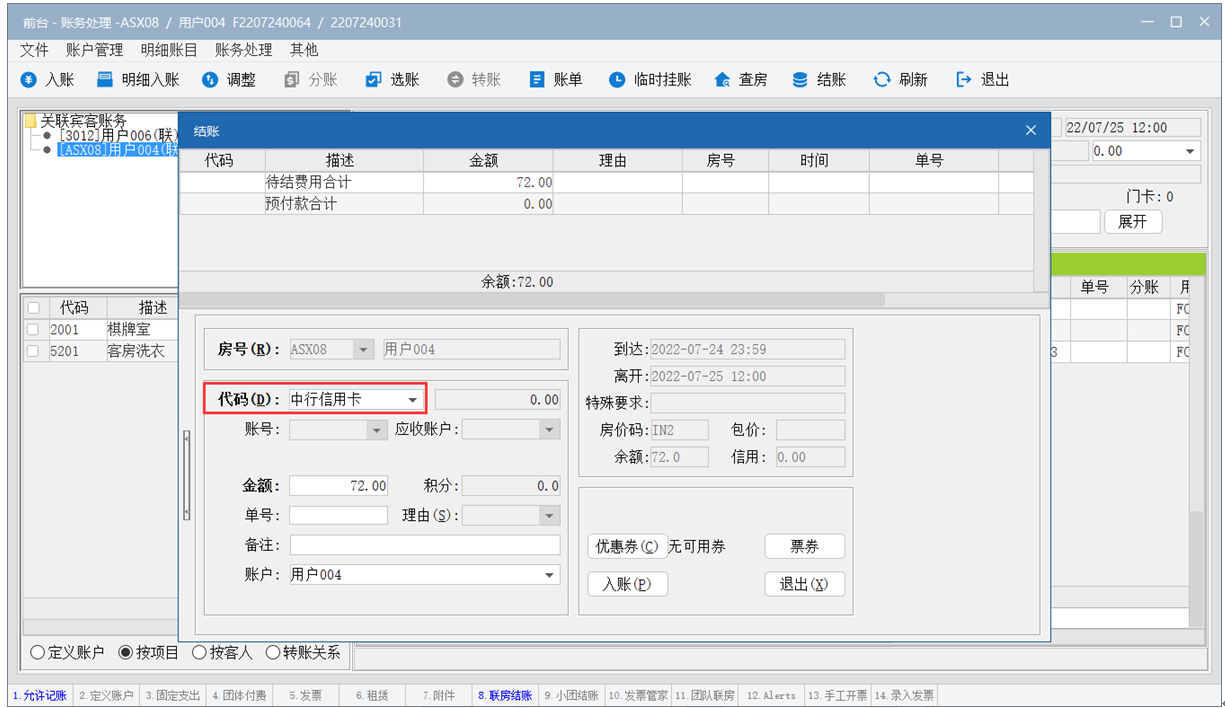注意:如入住时客人有信用卡授权,结账时仍用该授权消费,则打开『结账』窗口时系统默认结账方式为该信用卡,并自动显示该卡号和有效期,单击〖入账〗按钮即可。