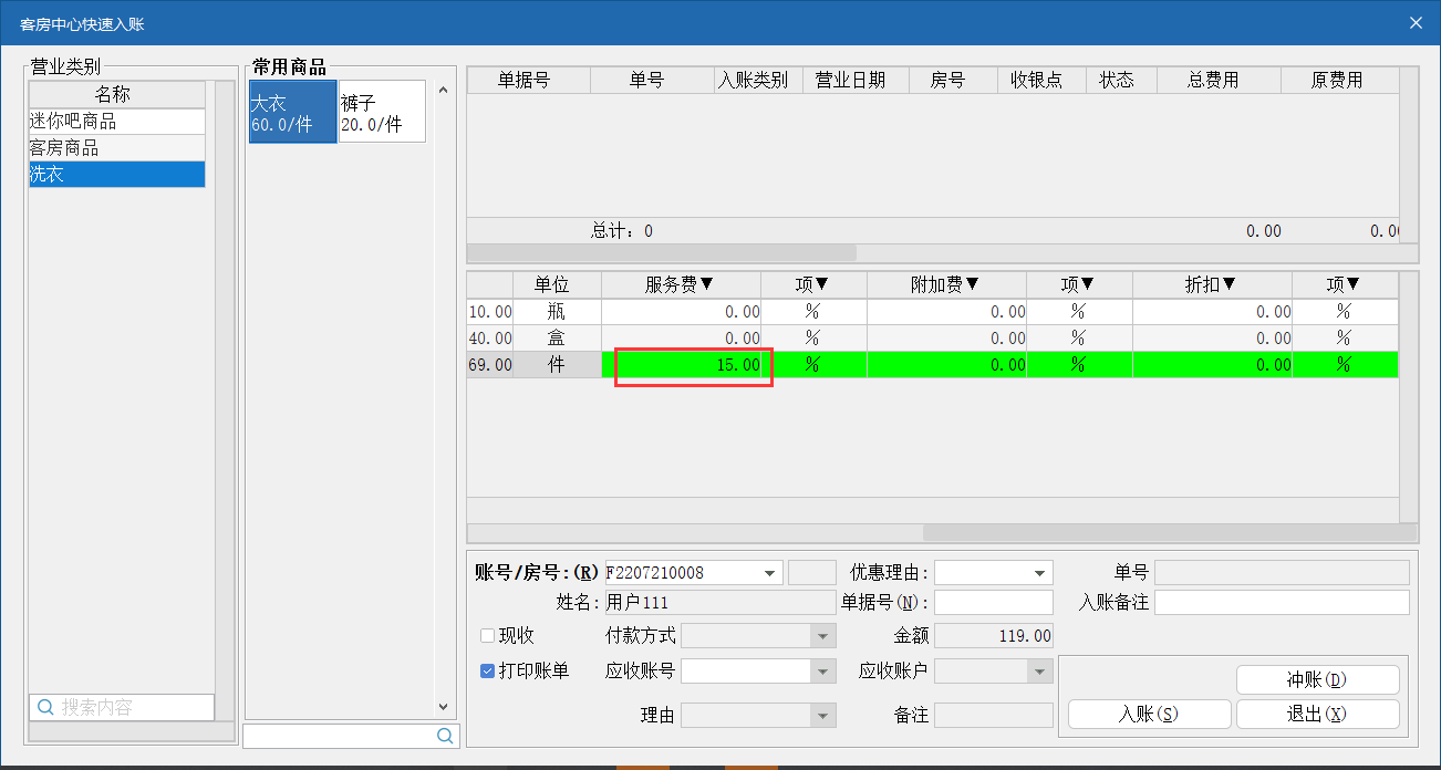 场景:客人谭松住店期间客房洗衣消费了干洗大衣1件,按酒店规定需收取15%服务费,如下图: