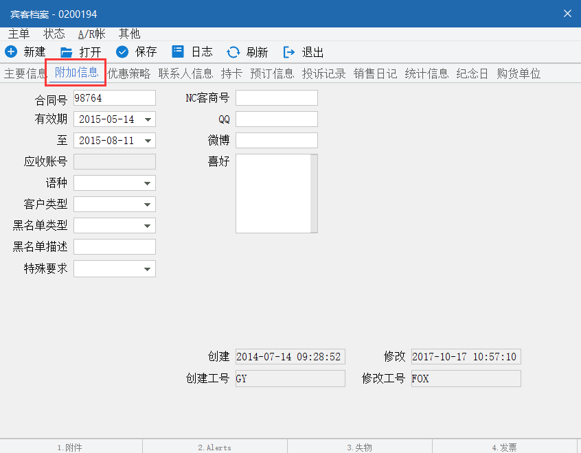 如果客人对酒店有投诉,可以将投诉内容输在该标签页中。当客人再次入住时,系统将会有提醒,避免该问题再次发生。