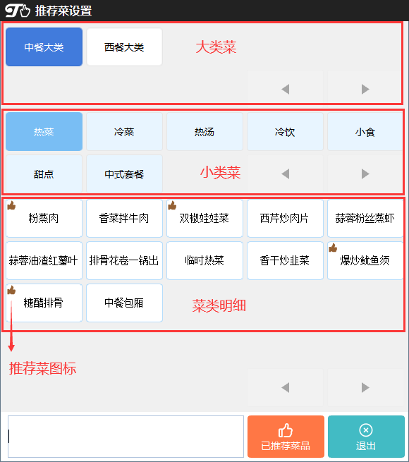 (2)单击〖推荐菜〗按钮,进入下图所示窗口,上方为菜的大类,中间为菜的小类,下方为菜品明细;点击菜品名称,显示图标“