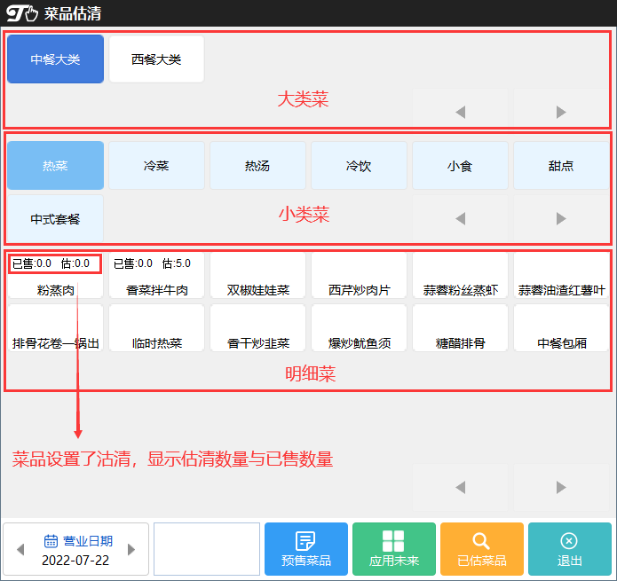 酒店餐厅可能会有某个菜品卖的比较好,但是每天准备的原料有限时(即限量销售),可以在系统中使用【沽清】功能,点菜员点菜时能看到菜品实时剩余数量,因此可以避免厨房做不能出品从而引起客人投诉。操作步骤: