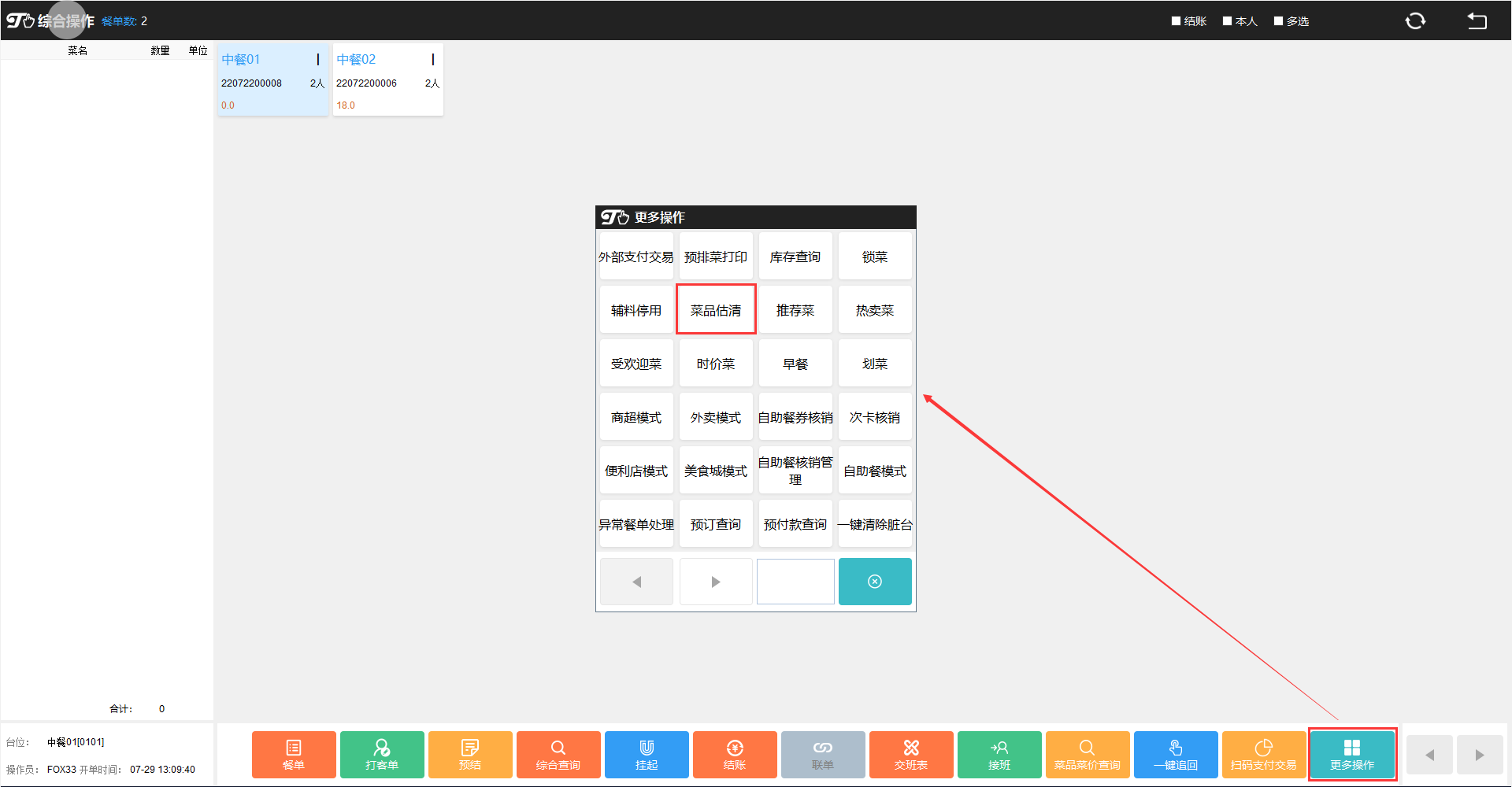 (1)执行综合操作→更多操作→菜品沽清。如下图: