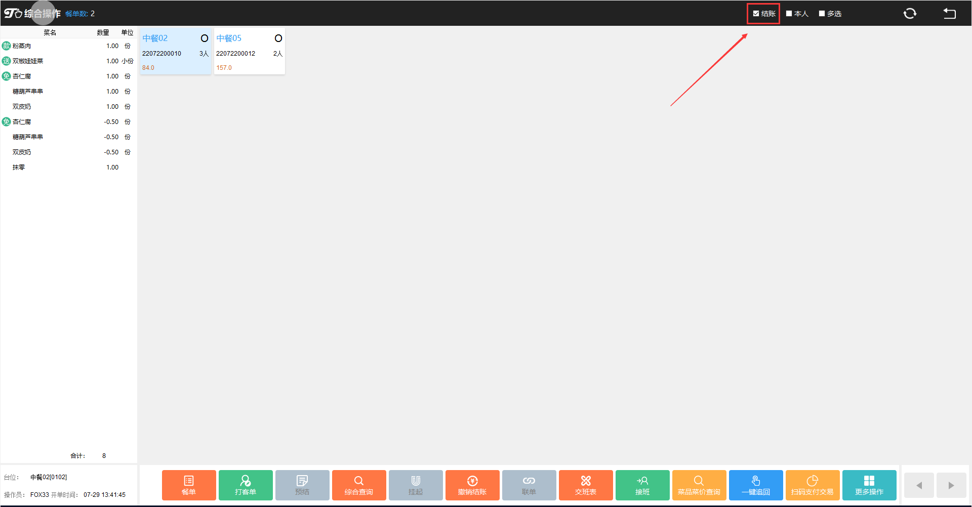 (1)单击『台位图』界面下方的〖综合操作〗按钮,进入该界面后,把该界面右上方的结账框打上勾,系统将显示已结账务。