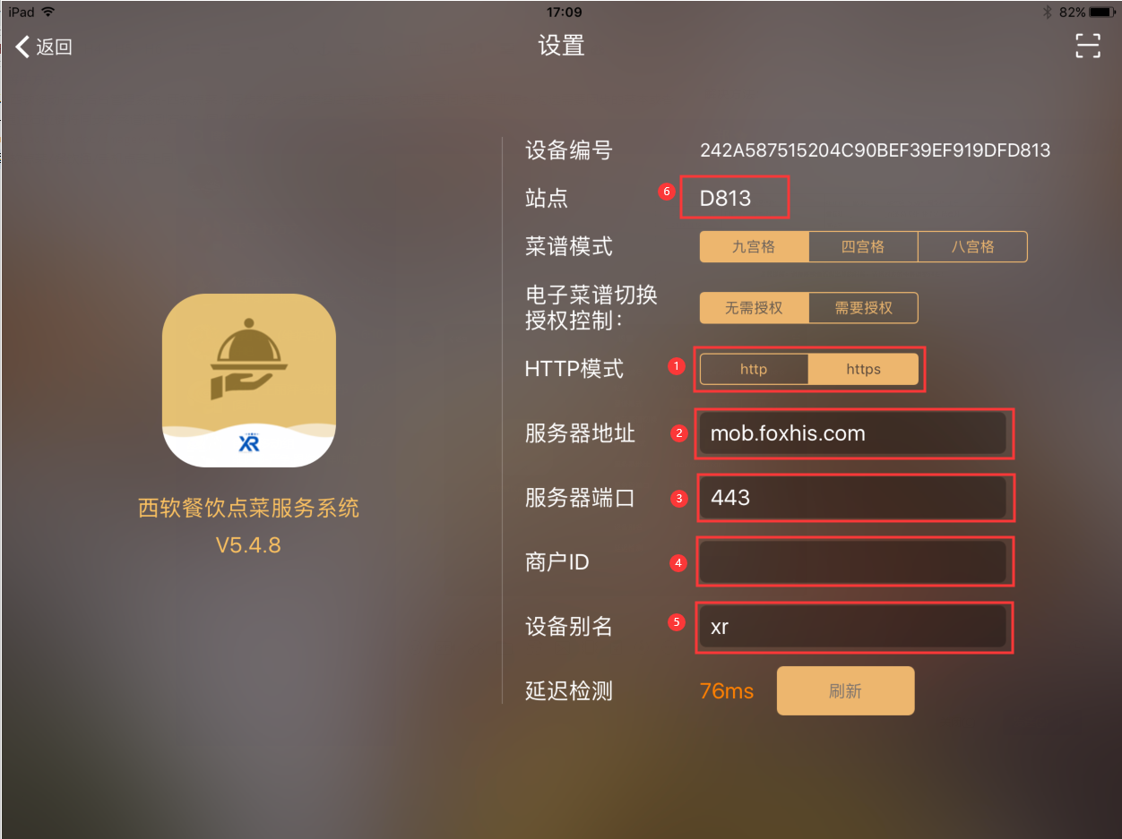 1)ipad西软点菜:①HTTP模式选https-②服务器地址:mob.foxhis.com【本地化的酒店除外】-③服务器端口:443【本地化的酒店除外】-④商户ID:找管理员索取-⑤设备名【用以区分设备】-⑥站点【XCS的需要将该站点添加到POS收银点,XMS请忽略】-回到登录界面登入账号密码-提示设备已注册,请找管理员授权-按第3)步操作
