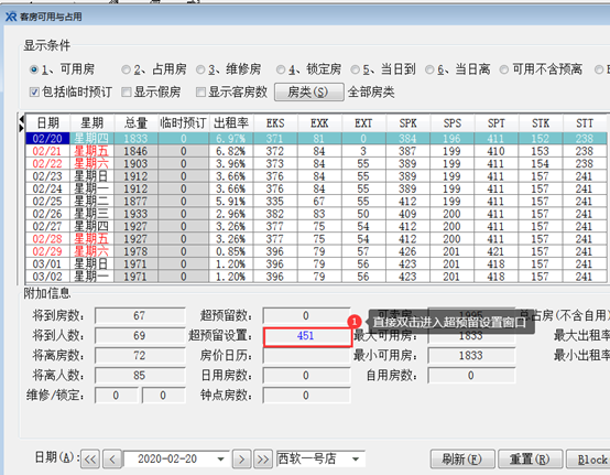 在酒店EXT房型有58间房,当该房型的预定和在住客人房数达到58间时,客房就会超预留。这时候,酒店可以根据以往的经验进行超预留设置,比如2间,这样在58间的基础上可以多预定2间,即60间。