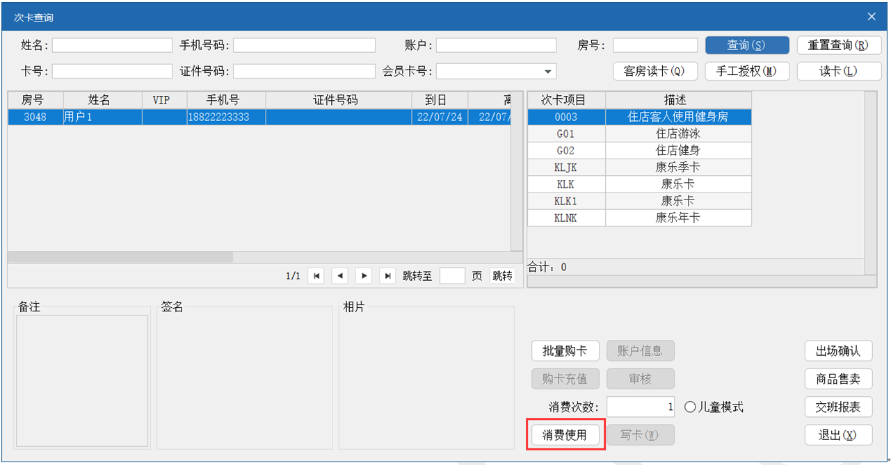 1.在『次卡查询』界面中查找到客人信息,单击〖消费使用〗按钮,如下图所示: