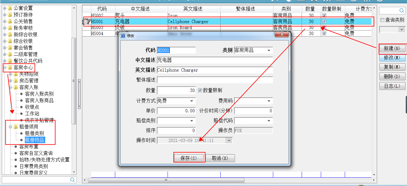 2)维护模块→客房中心→租借领用→租借物品,点击新建,输入需要新增的租借物品代码、描述以及对应的租赁类别后点击保存,如图所示。