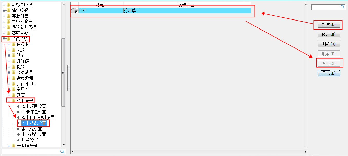 2)维护模块→会员系统→次卡管理→次卡站点设置,点击新建,输入对应的站点和次卡项目后点击保存,如图所示。