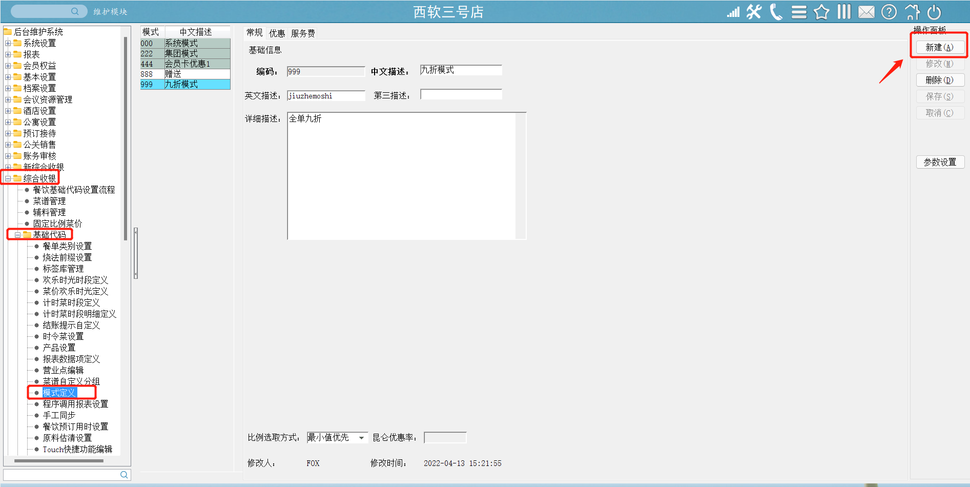 3) 点击右侧新建按钮,如图2中箭头红框所示位置,添加一个新的餐饮模式,编码、中文描述、英文描述等根据实际情况设置,完成后点右边保存按钮,如图3箭头红框所示位置。