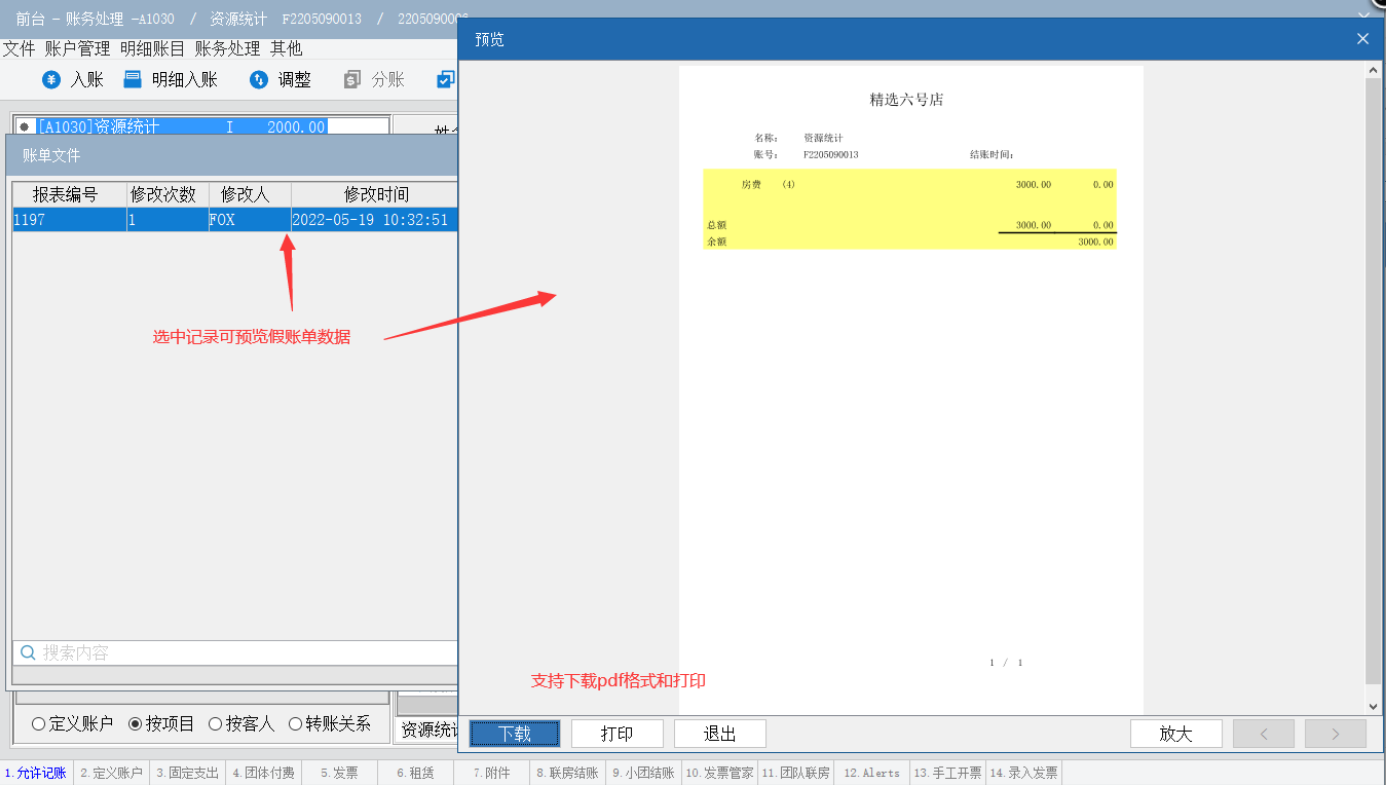 2)前台账务处理下面增加账单文件查看,可预览保存后的自定义账单,支持下载和打印。