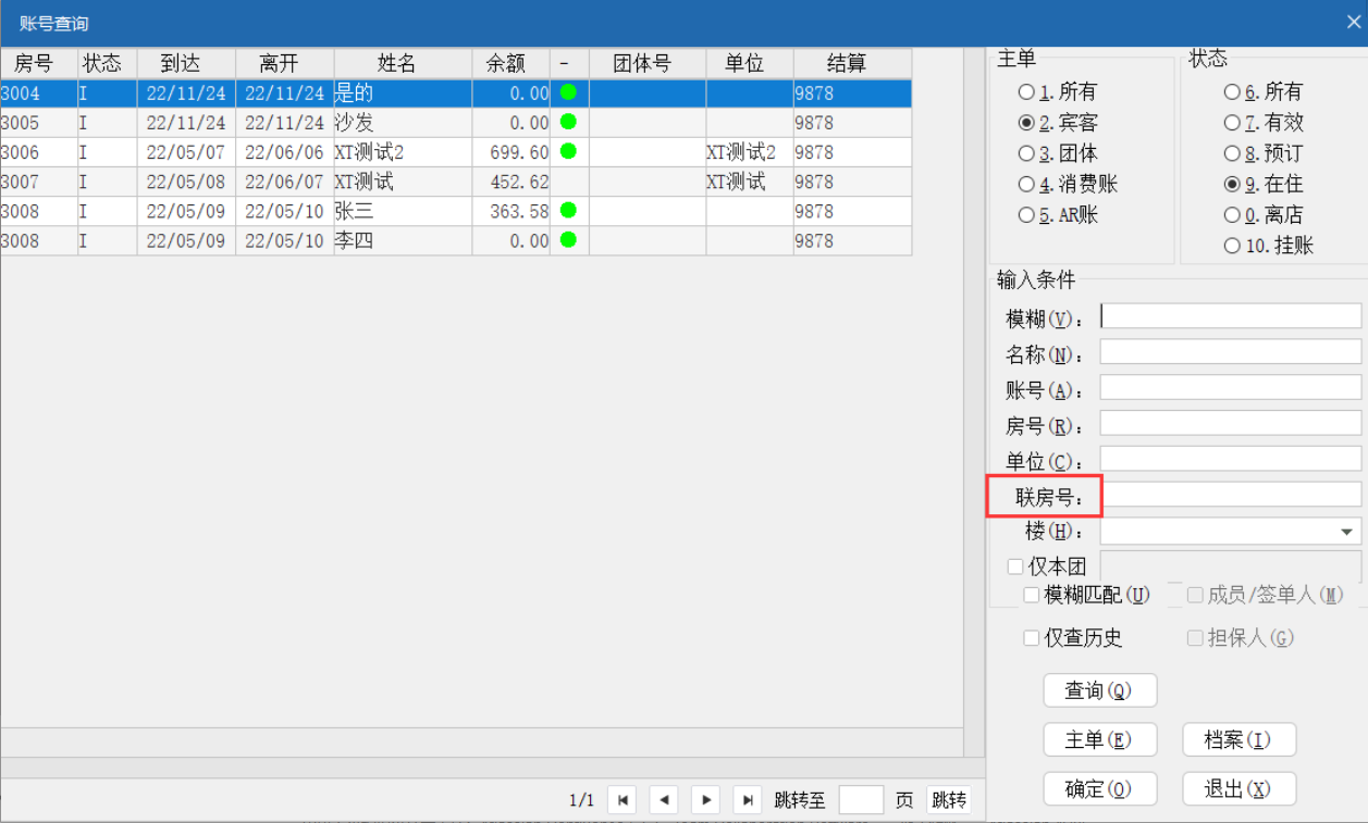 (2)『账号查询』界面,查询条件增加【联房号】查询、列表『组合条件查询』中增加【联房号】查询、系统左上角模糊搜索结果的功能中增加联房号,双击联房号进入『联房号列表』界面。