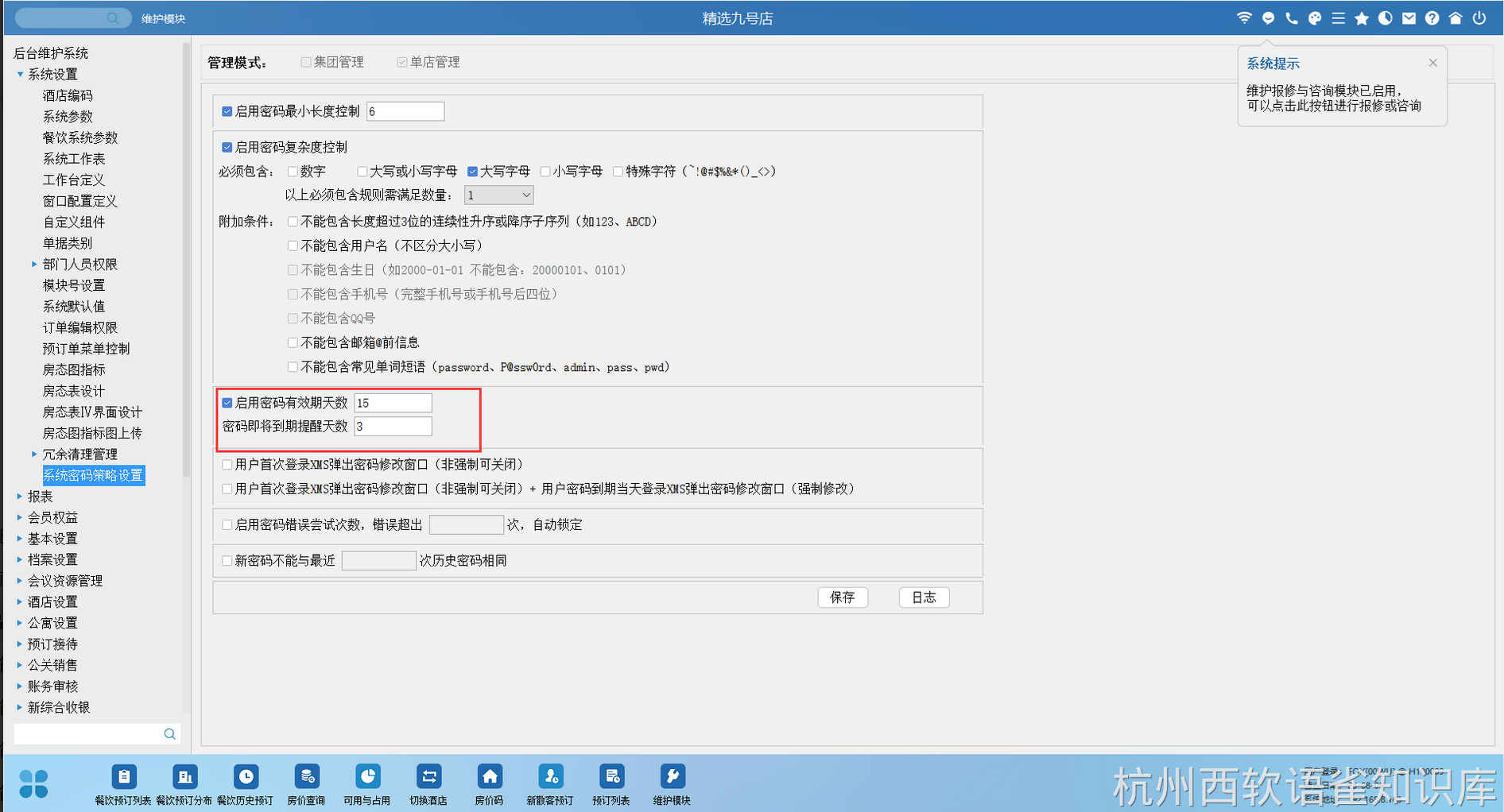 (4)密码到期提醒天数,设置为单店管理模式时,可由酒店独立管控提醒天数。