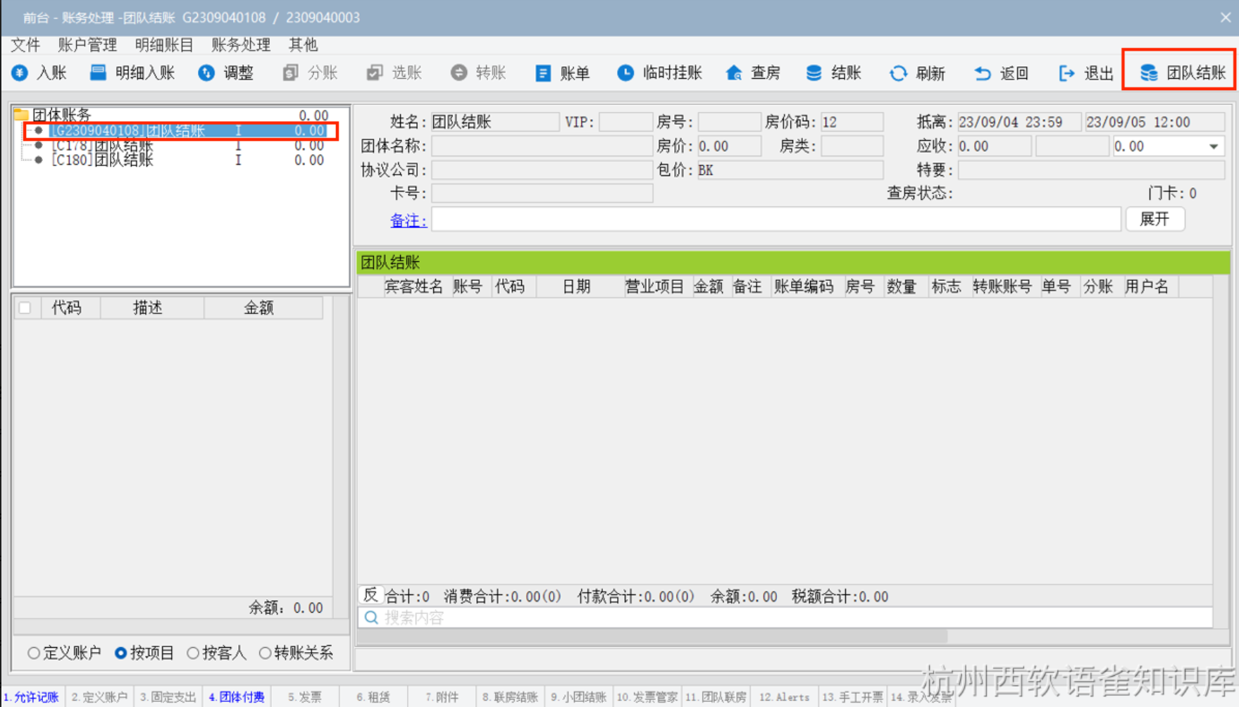 1)账务处理窗口-选择团队节点-单击团队结账,进入团队结账界面