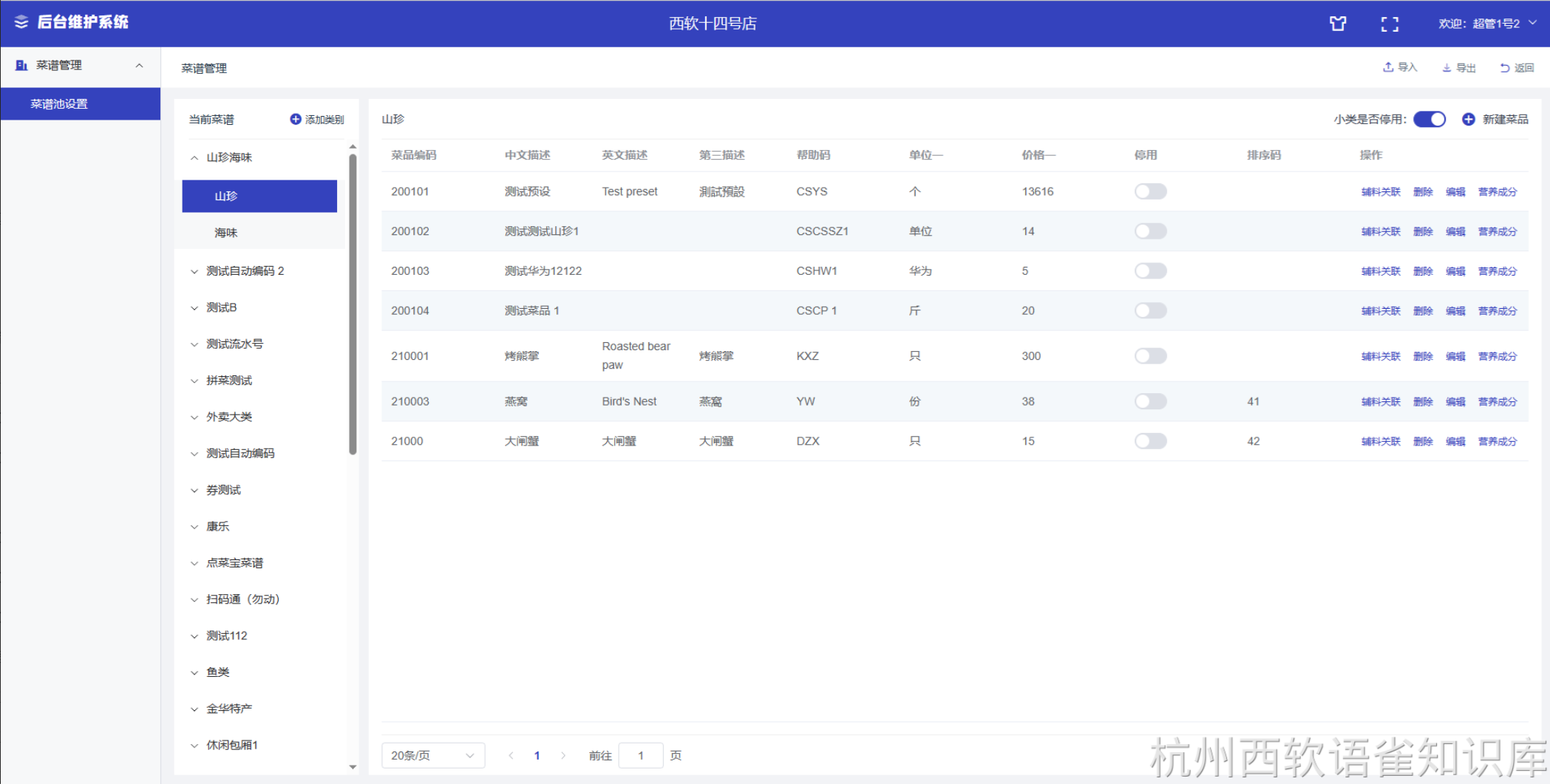 营养成分管理同周菜谱,也是需要到新版餐饮后台网站中进行设置。点击菜谱管理,即可看到当前菜谱的大类,小类及菜品列表
