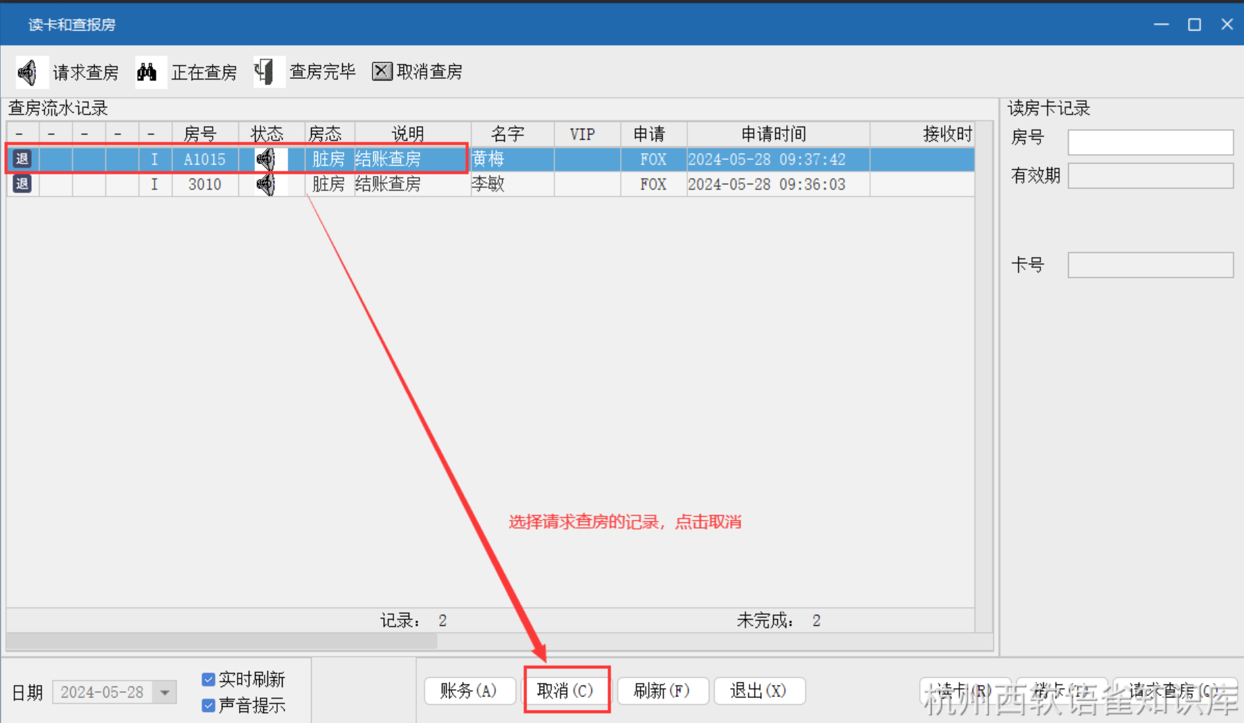 (3)如因操作失误发送查房请求,可以选择对应记录,单击〖取消〗,进行取消查房操作;