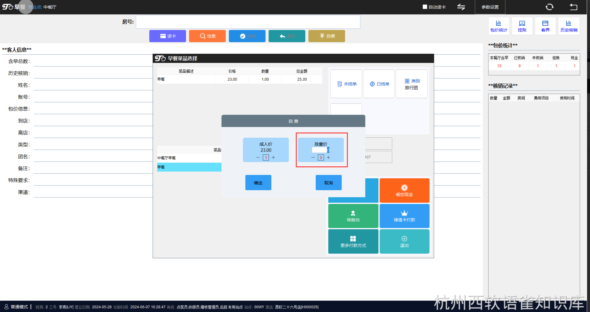 (2)『早餐菜品选择』窗口,显示已选菜品和可选菜品(包括成人价格和孩童价格),点击所需要菜品后,可根据客户需求增加或减少成人和孩童的菜品数量,且价格为0的菜品可进行价格调整;