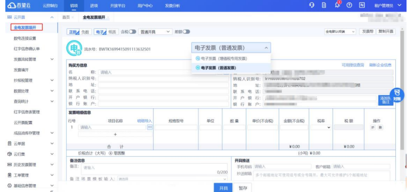 - 正数发票开具: 登录【销项】 -【云开票】 -【全电发票填开】 页面,输入开票信息后,点击“开