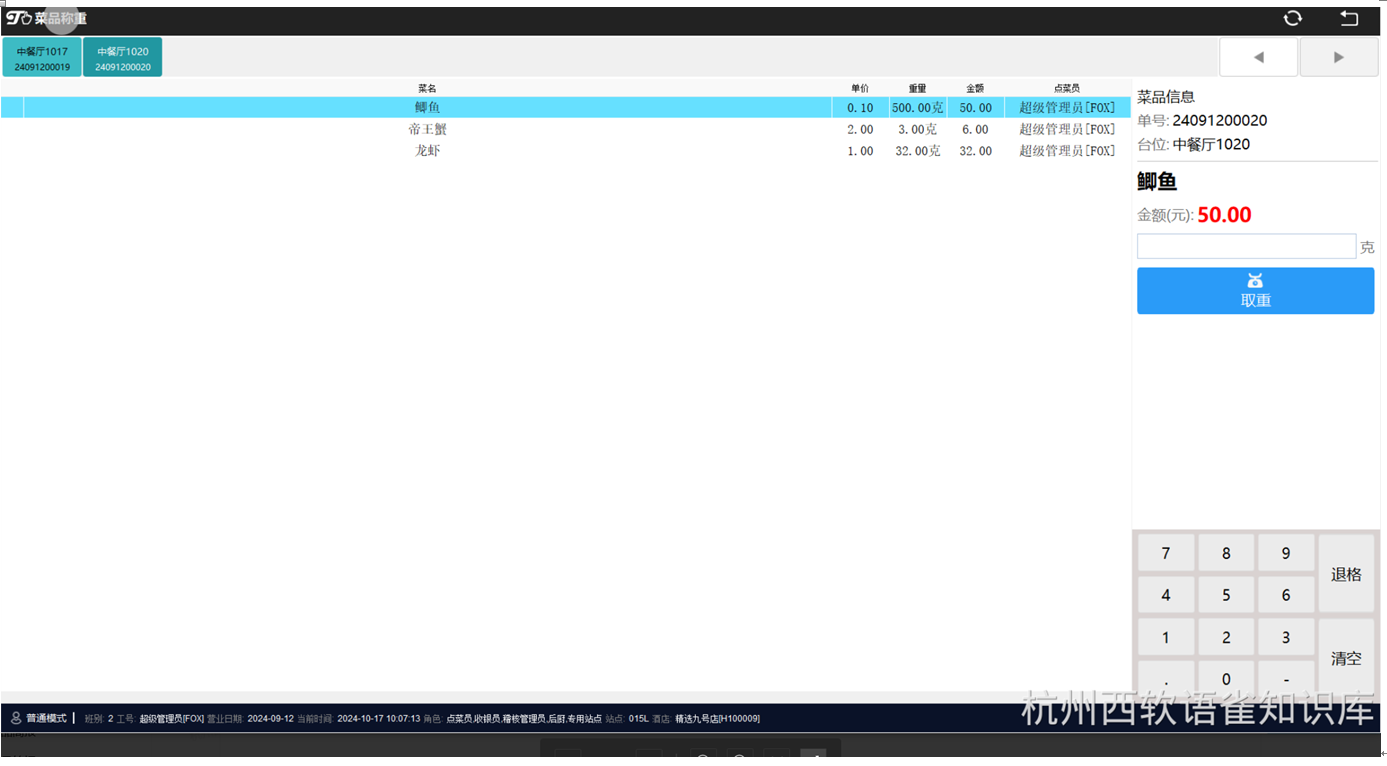通过顶尖电子秤(【京东】https://3.cn/27S-OLVe 「顶尖aclas通讯秤」 点击链接直接打开)对计量菜进行称重,获得菜品实际重量,取重后即可更新餐单中菜品的重量和金额。
