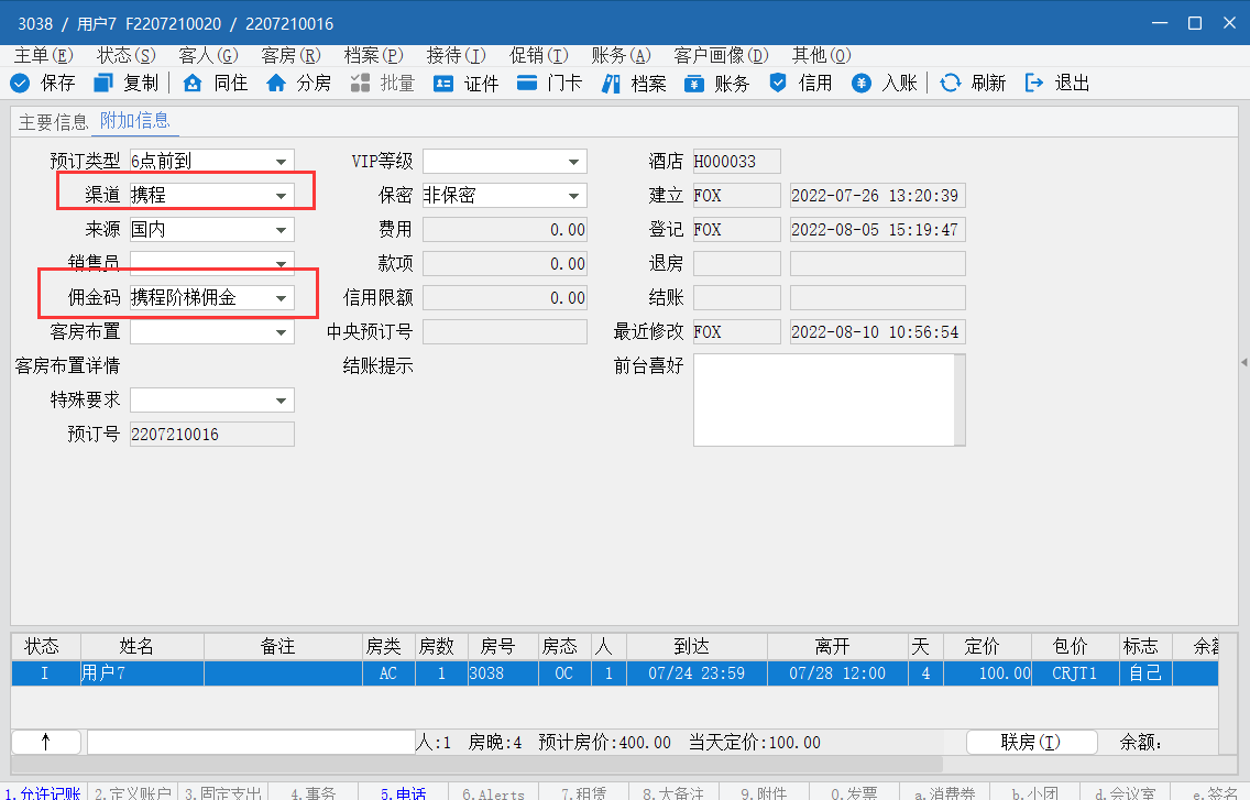 与上方的预订类型设置方式相似,且同样会将渠道、佣金码及付款方式带到客人预订主单,以上信息可在客人未结账前进行修改,如下图所示:
