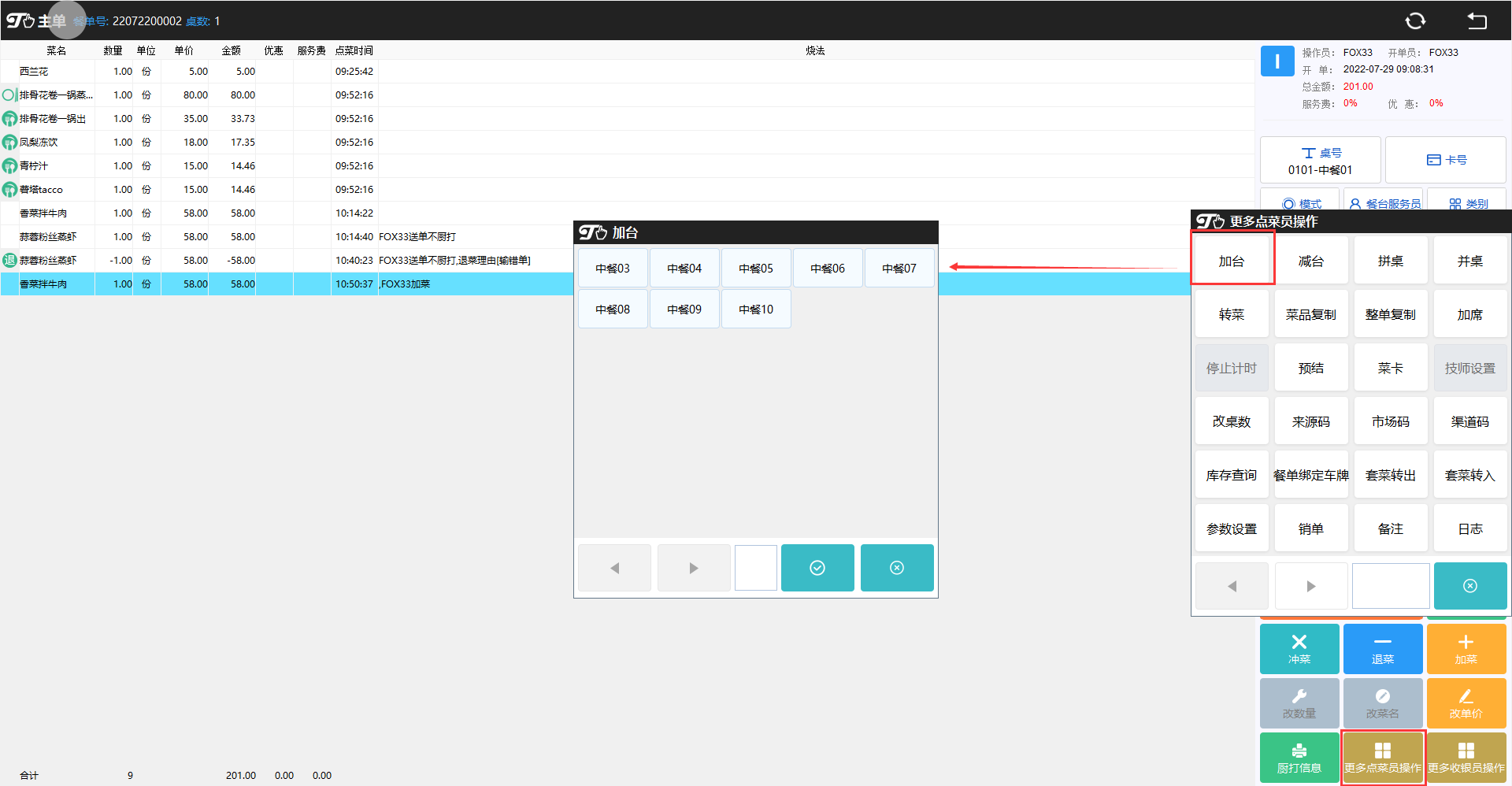 【加台】:同一批客人使用的多个桌号,则可单击〖更多点菜员操作〗按钮,单击〖加台〗按钮,单击选择空闲的桌号即可,点击加台产生的台位与原台位餐单号一致,并且餐单内容一致,单击添加的台位查看菜品显示与原台位一致。