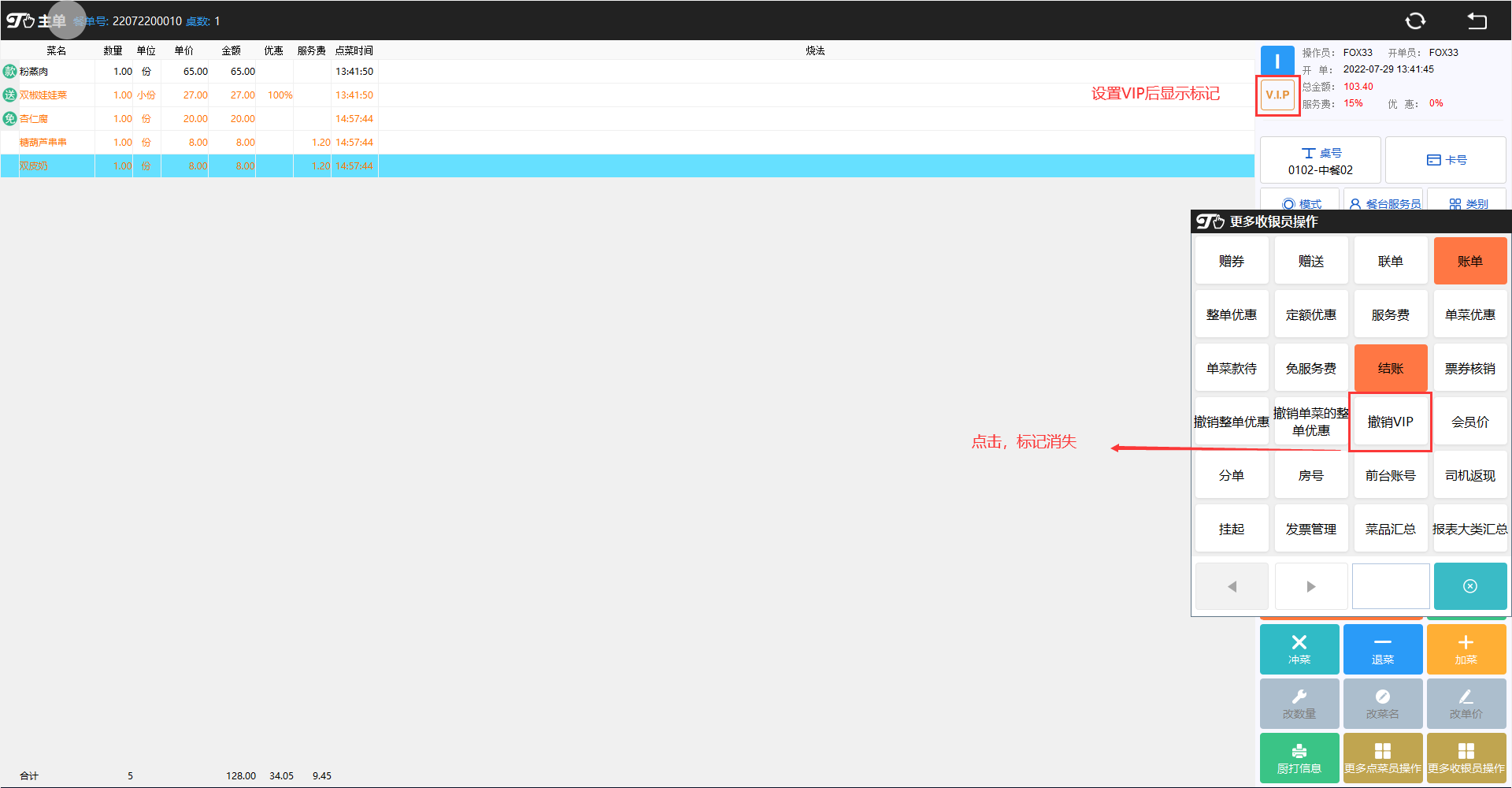 若客人为VIP客人,在『更多收银员操作』界面下,单击〖VIP〗,单击〖确认〗按钮即可,窗口右上方会显示此桌为VIP。