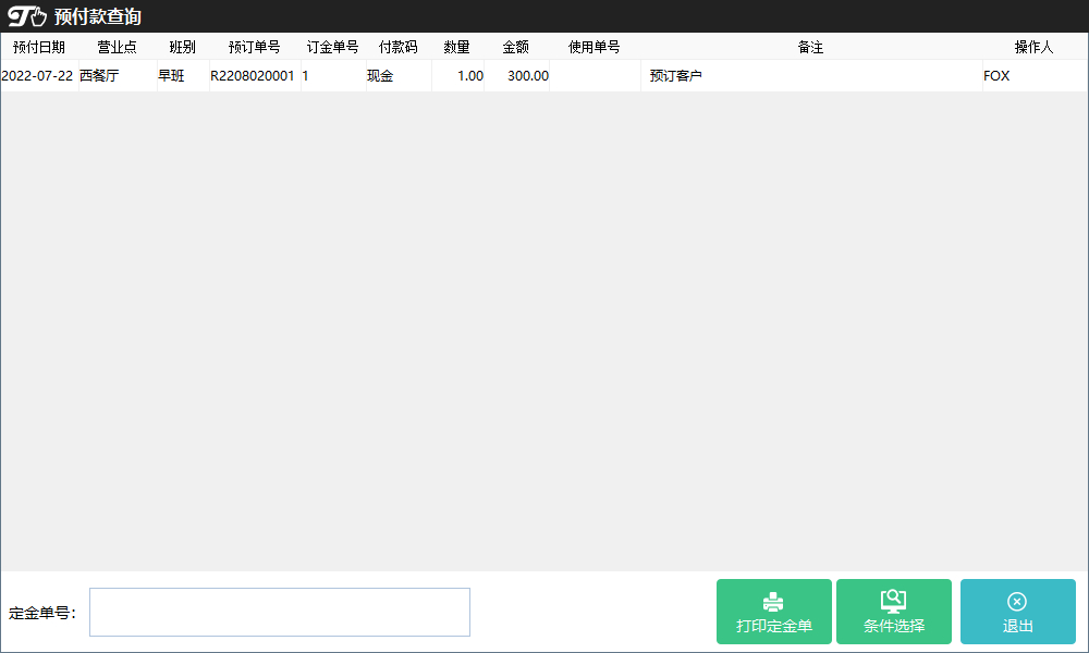 (2)单击〖更多操作〗按钮,再单击〖预付款查询〗按钮即可查看有预付款的订单。如下图: