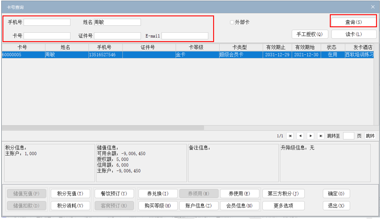 (2)在结账时【代码】 处选择储值卡付款方式,在跳转出的卡号查询界面,输入相应信息查找对应储值卡。如下图所示: