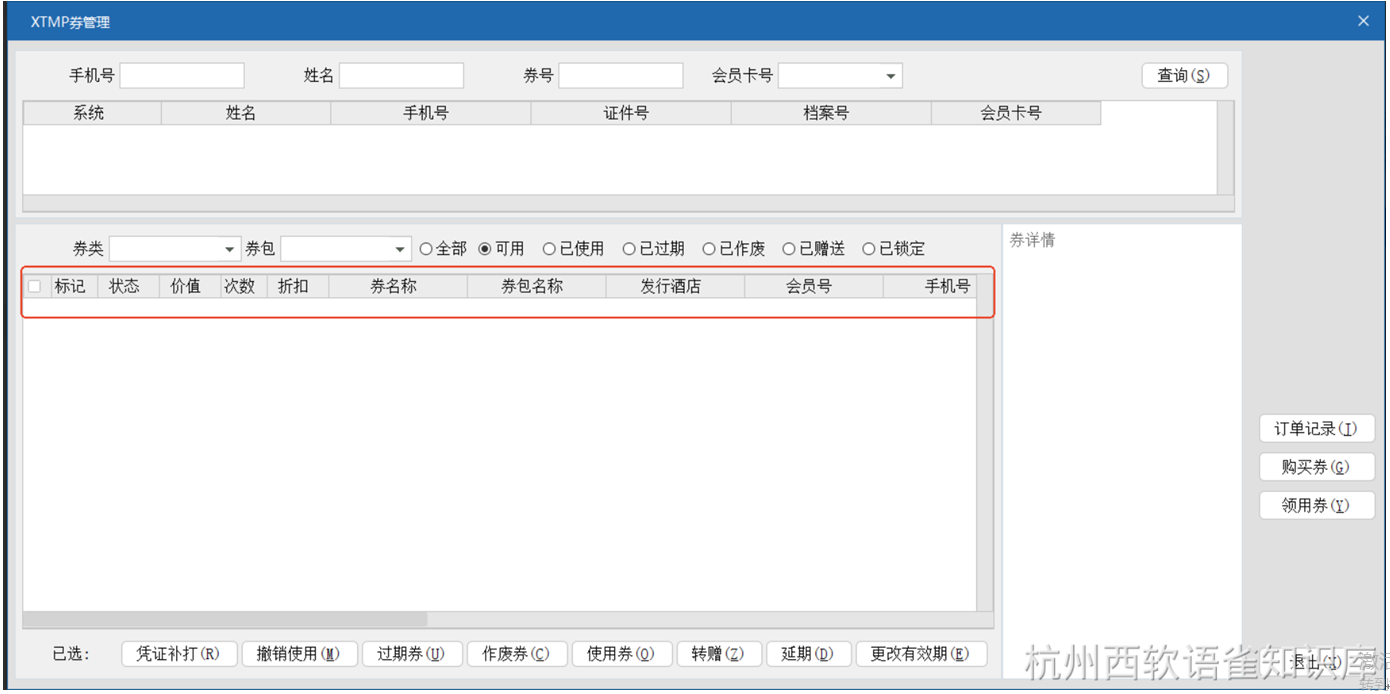 通过手机号查,查询出手机号购买的券,以及会员卡购买的券。见下图: