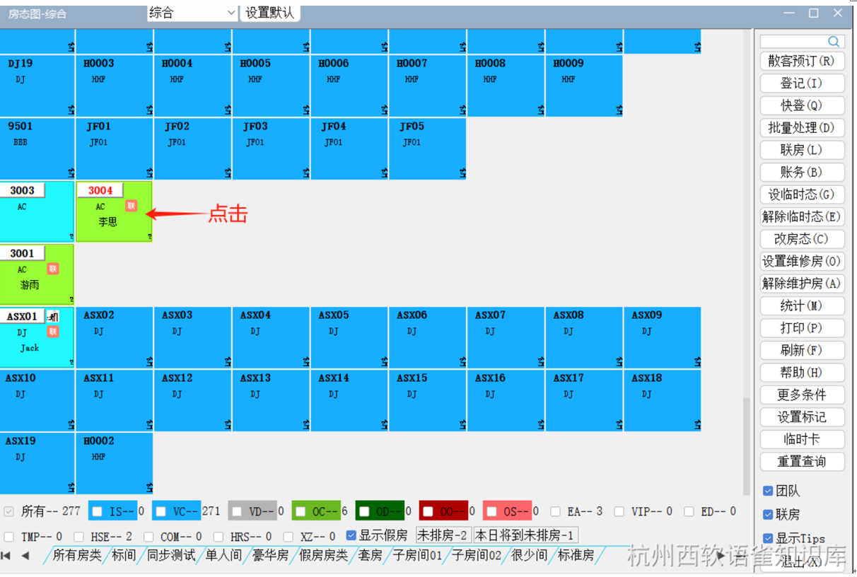 点击3004房间,3001房间为在住关联订单会联动高亮,ASX01房间为本日到预订关联订单会联动高亮,3003房间为非本日到预订关联订单会联动高亮。