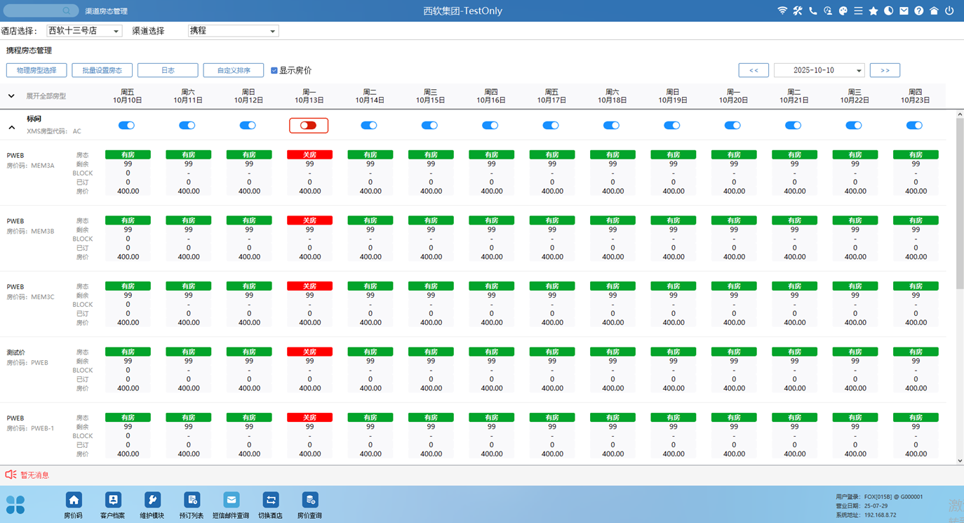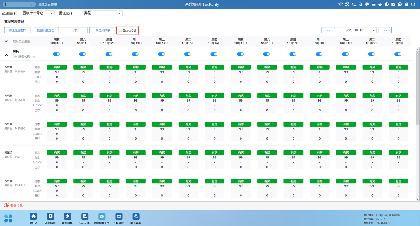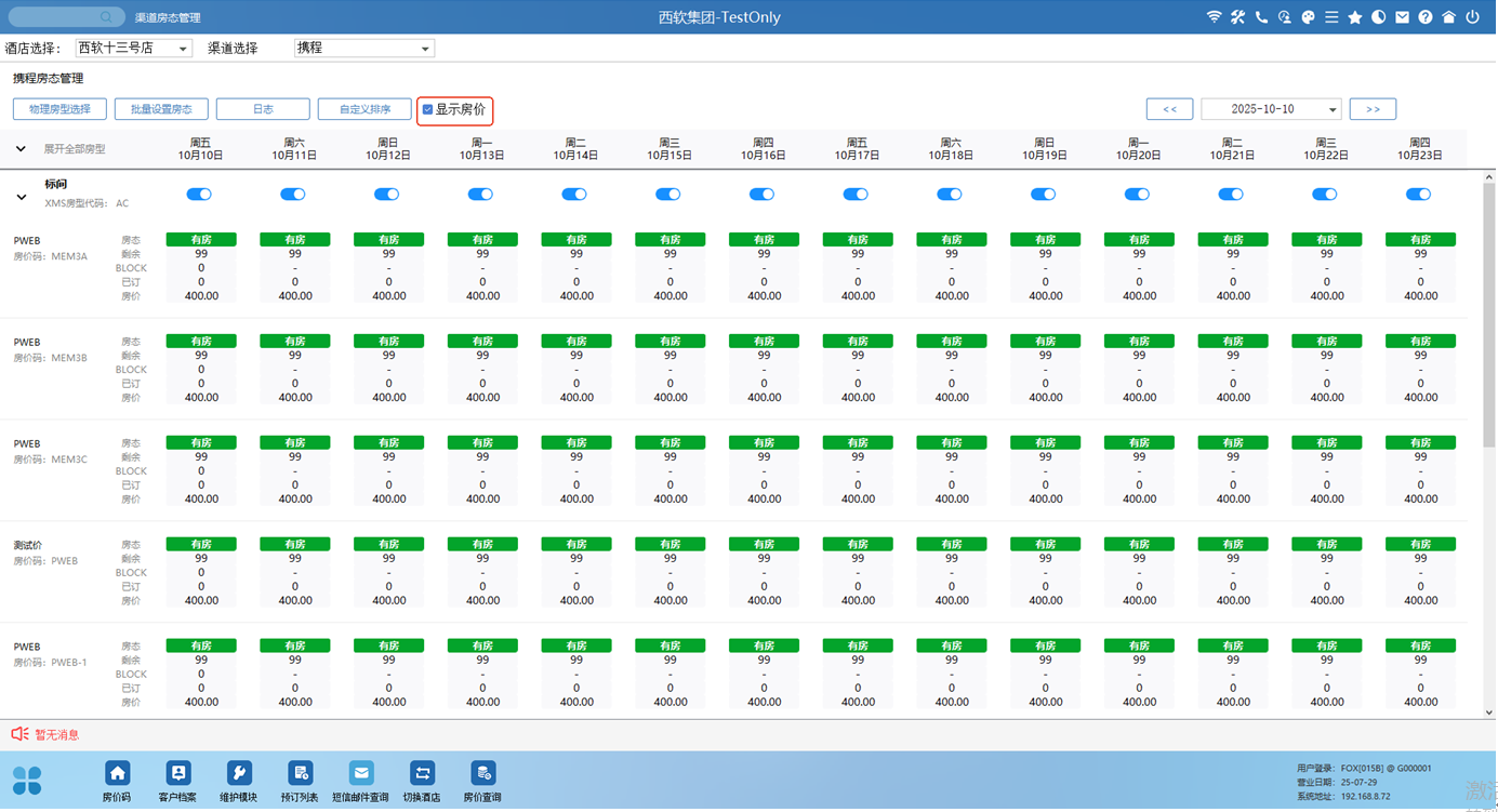 (2)『渠道房态管理』界面可查看2周内的房态、房量、房价数据,勾选“显示房价”后可显示每日房价。