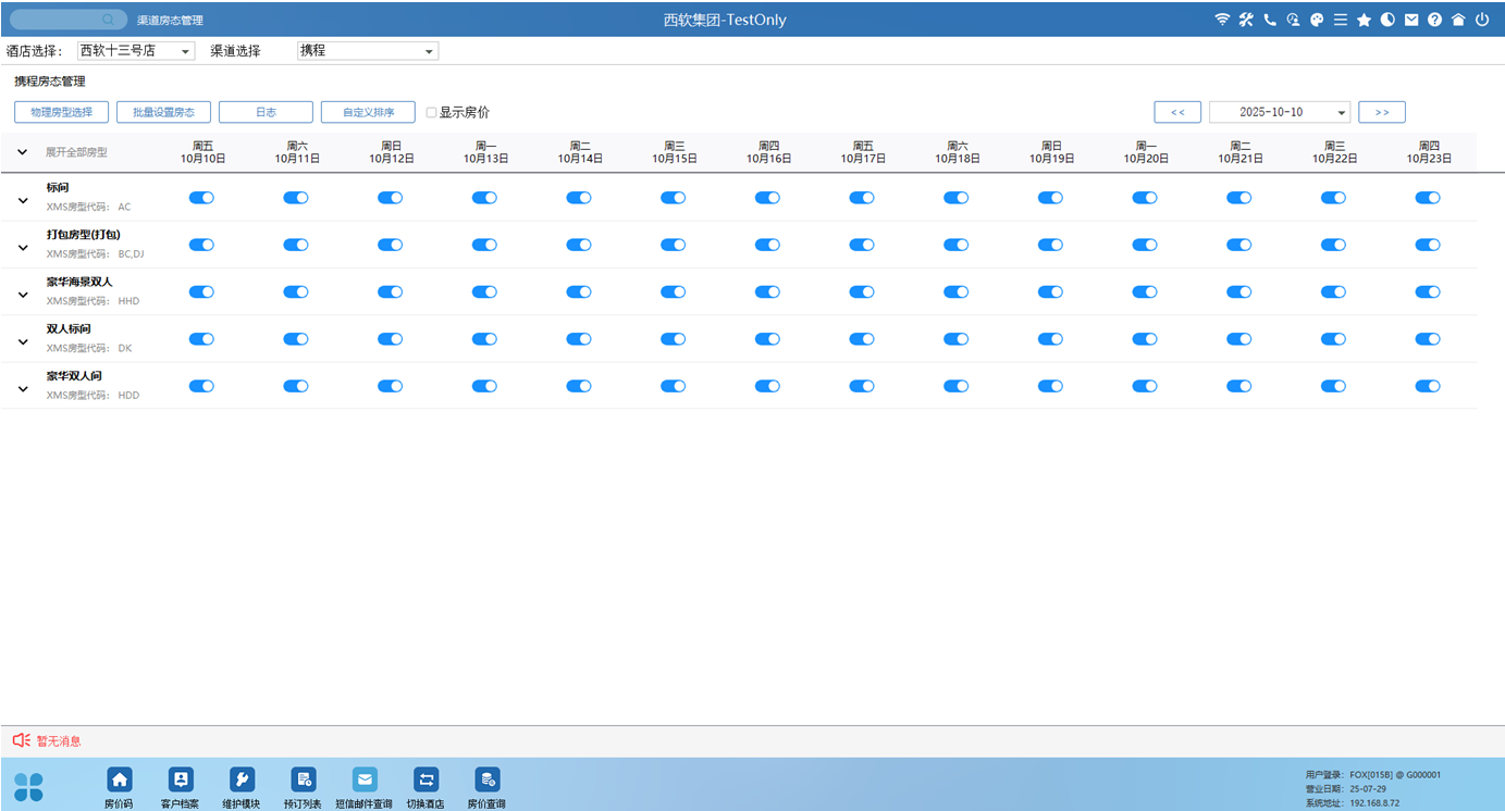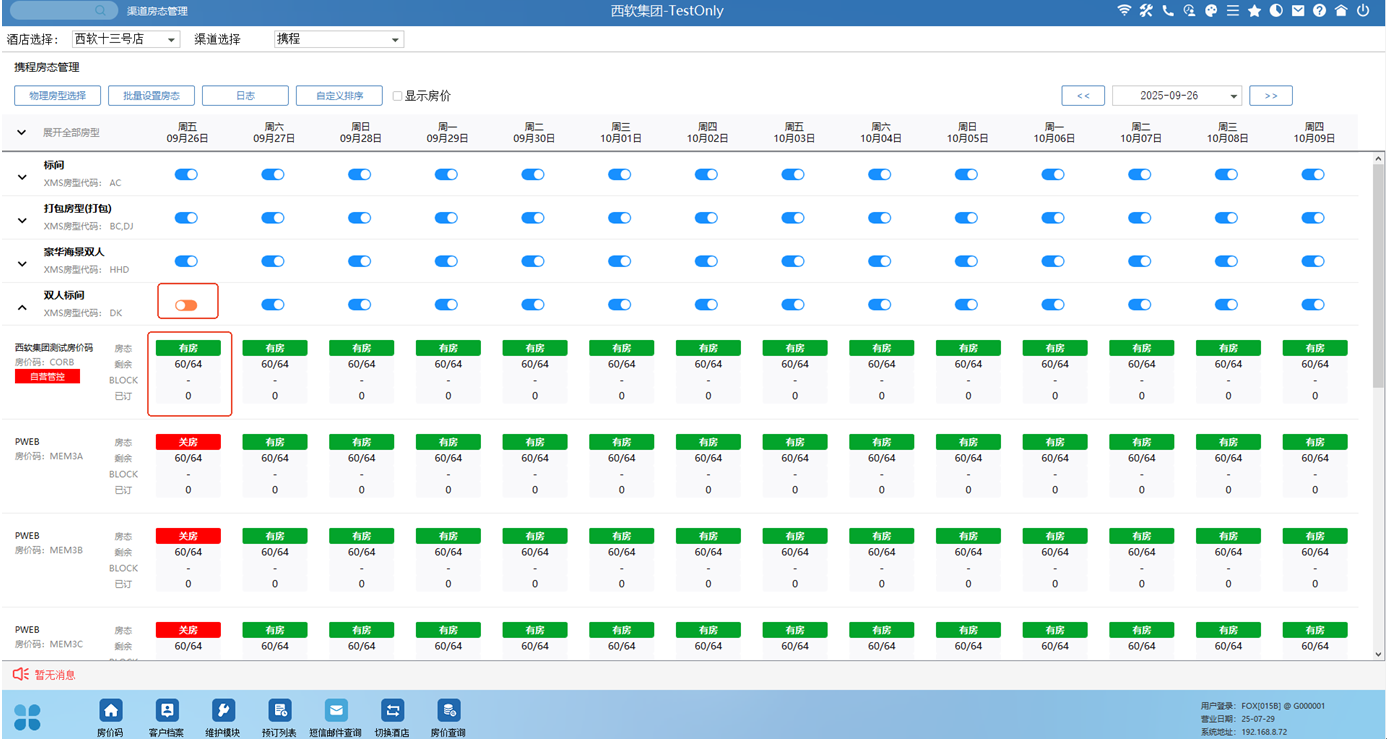 『渠道房态管理』界面支持设置房态,单击房态开关,选择〖是〗后,可快速对该房型当天房态进行设置。