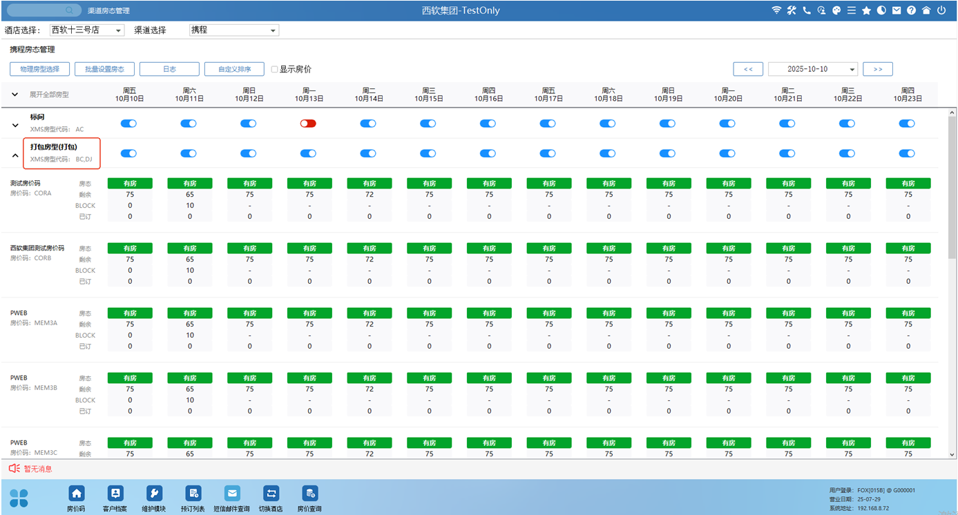 渠道发布打包房型后,『渠道房态管理』界面上也支持显示打包房型,房型名称显示打包房型名称,在名称后增加[打包]字样,XMS房型代码显示所有打包的房型代码。
