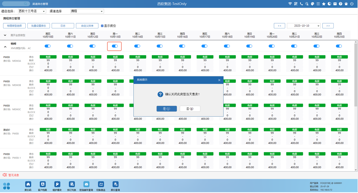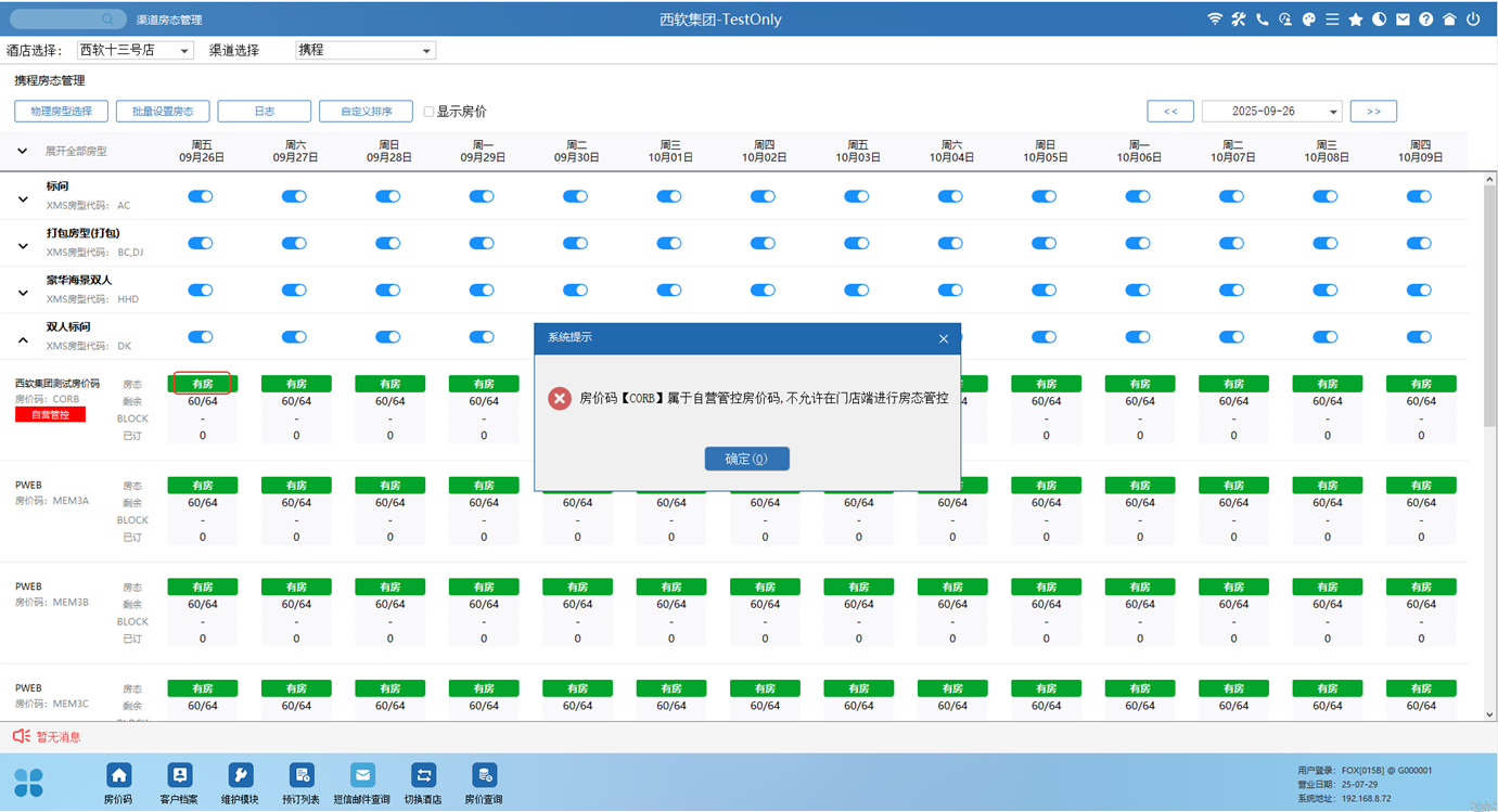 当管控模式为非自营管控时,房价码会显示非自营管控。点击房态开关会提示房价码XXX属于非自营管控房价码,不允许在门店端进行房态关闭。