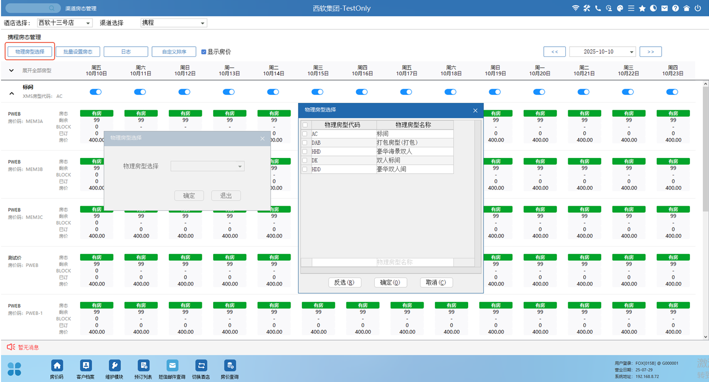 『渠道房态管理』界面支持筛选物理房型,单击〖物理房型选择〗,打开『物理房型选择』窗口,选择物理房型(可多选)后,单击〖确定〗,即可筛选物理房型。