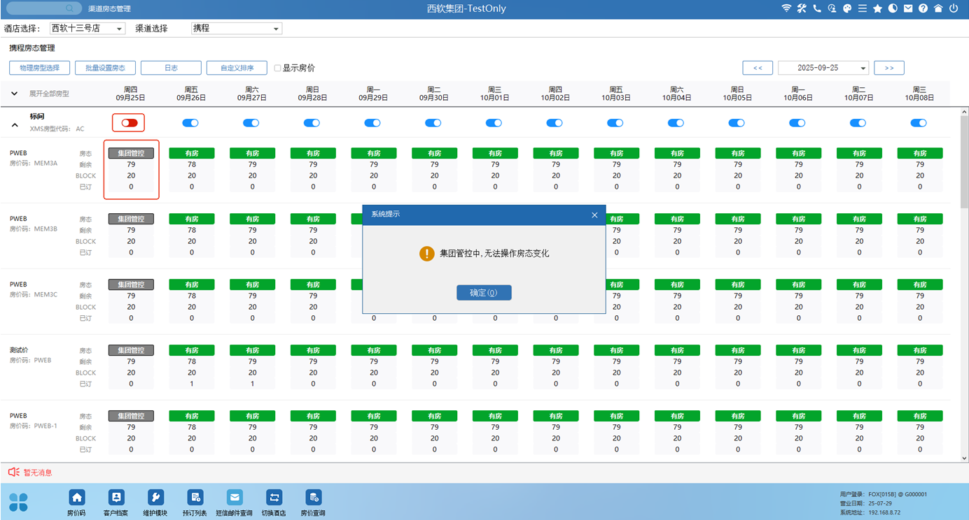 当酒店设置了自营房价码管控后,房价码会显示自营管控,点击房态开关会提示房价码XXX属于自营管控房价码,不允许在门店端进行房态管控。