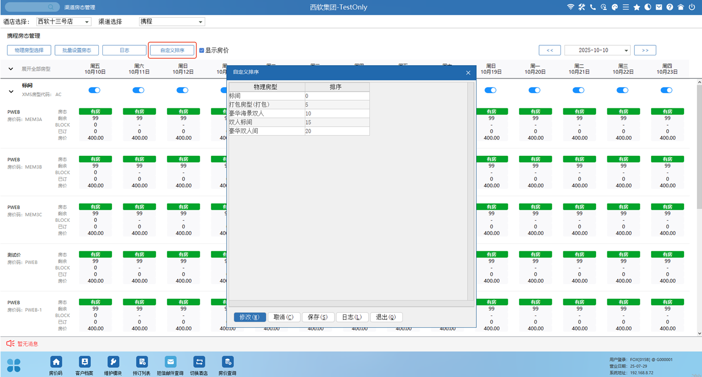 『渠道房态管理』界面支持对显示房型进行排序,单击〖自定义排序〗,可打开『自定排序界面』,设置相应房型的排序数字保存后,XOP房态界面的房型会按照顺序从小打到排序。自定义排序不支持分渠道,一个酒店所有渠道在XOP房态管理中只有一个排序规则。