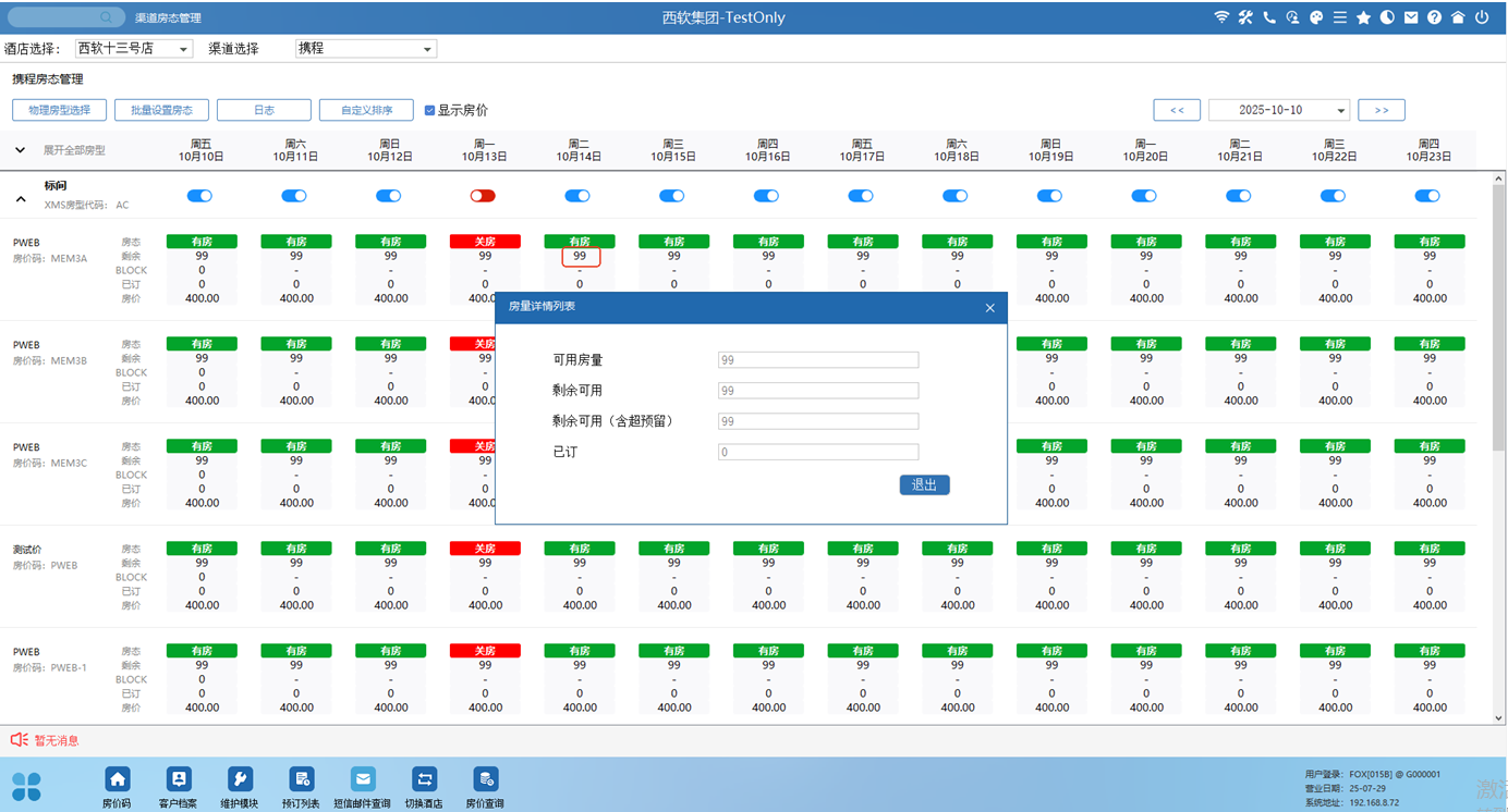 单击房态图有房/无房/关房可打开房态维护界面,可对所单击的产品房态进行开关;单击房态开关,可对所选房型当天所有房价码一键开关。