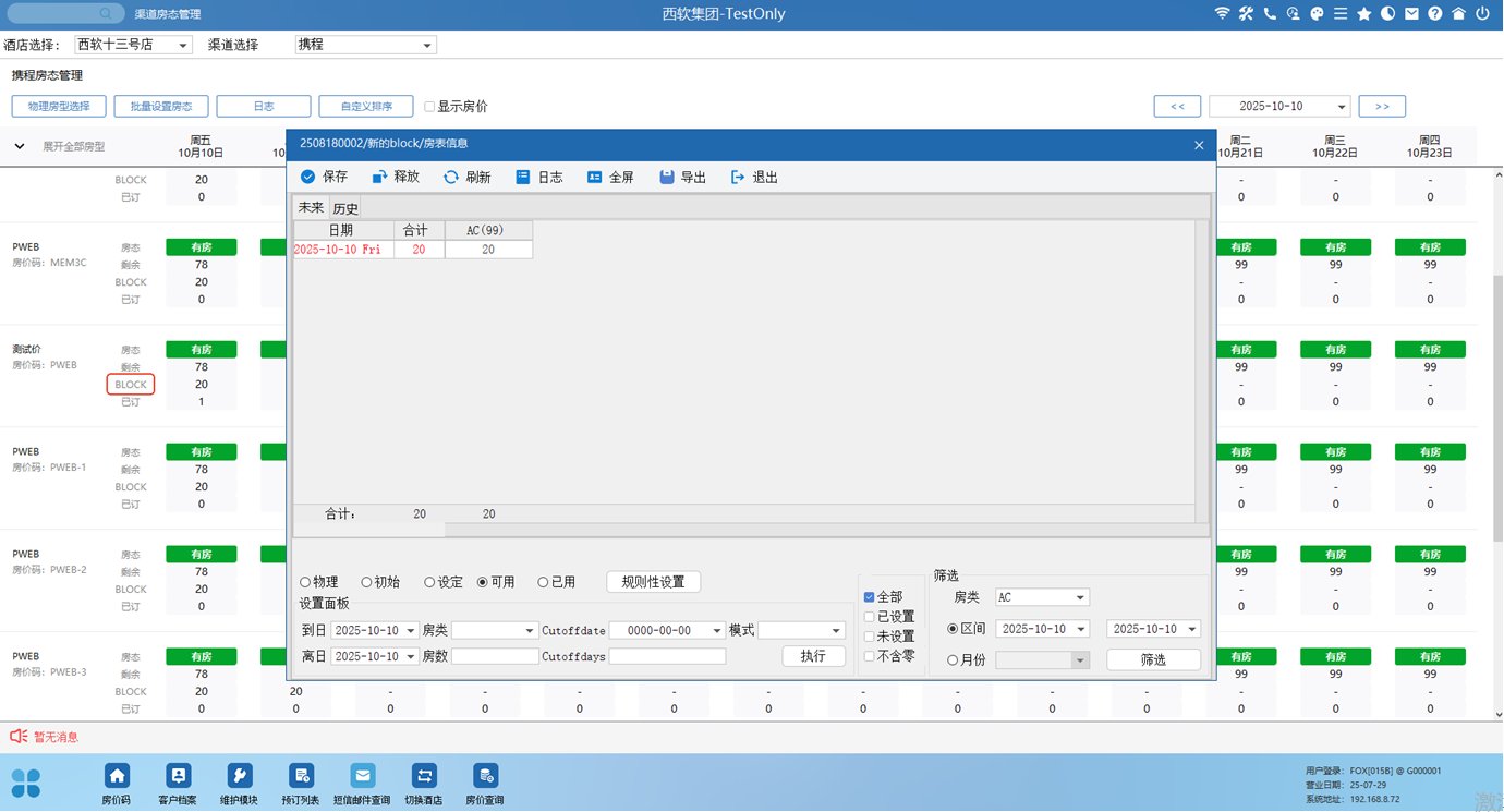 『渠道房态管理』界面支持查看BLOCK数据,双击界面上block的房量可以穿透打开block的房表信息界面。