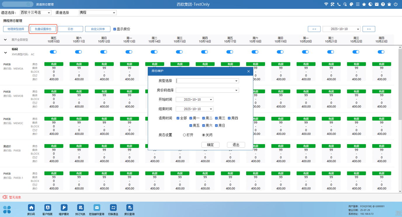 『渠道房态管理』界面支持批量设置房态,单击〖批量设置房态〗,打开『房态维护』窗口,选择房型和房价码,开始结束日期、适用时间,单击〖确定〗后,即可完成批量开关房态。