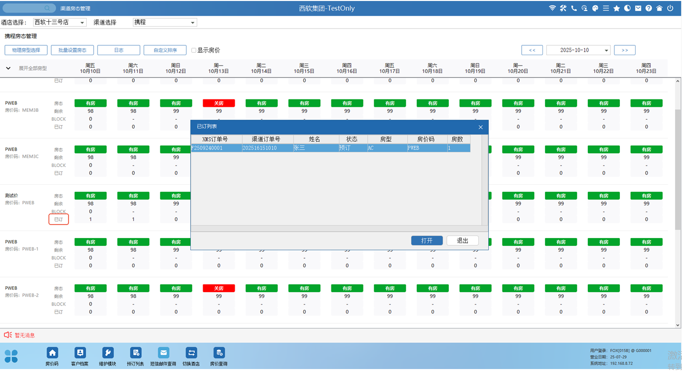 『渠道房态管理』界面支持查看已订列表,单击已订数值,可打开『已订列表』界面,列表内选择订单后,单击〖打开〗或双击订单可打开主单。